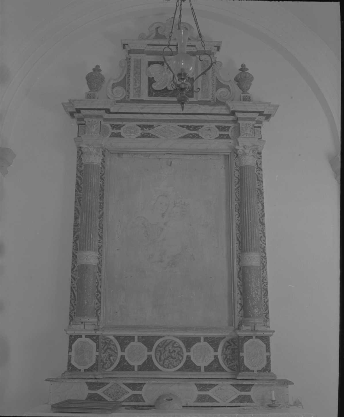 Il fastigo dell'ancona è ornato di motivi decorativi a volute e reca al centro un putto scolpito. Ai bordi dell'architrave, appoggiati su piccoli piedistalli, vi sono due vasi. Il fregio e lo stilobate sono ornati di motivi decorativi geometrici. Infine foglie d'acanto sono scolpite nei capitelli corinzi e motivi vegetali a volute nelle colonne
