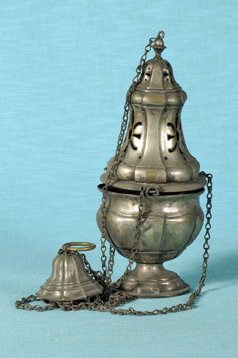 Turibolo a piede circolare con modanature e nervature che si ripetono nel corpo inferiore. La parte superiore presenta una decorazione traforata