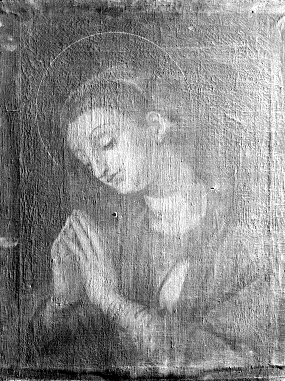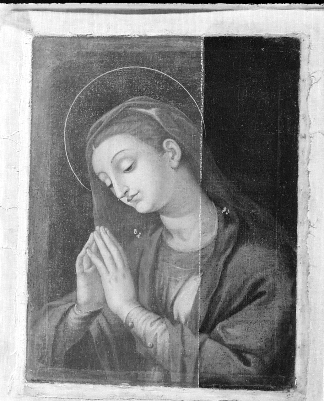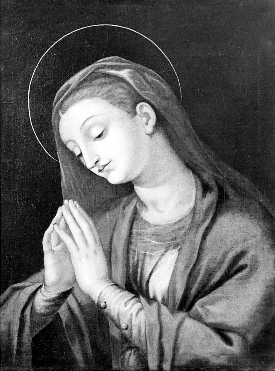 Su sfondo nero la Madonna, giovane, in raccolta preghiera, il manto blu su veste porpora