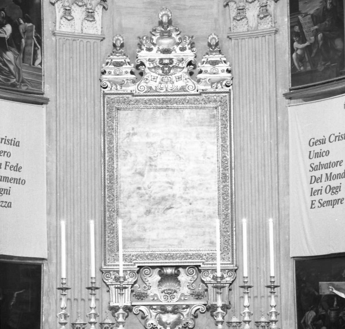 Il fregio della cornice rettangolare è formato da un tralcio continuo d'acanto disposto a volute; in alto è sormontata da un ricco fastigio adorno di teste di cherubini, festoni, conchiglie e volute, che si ripetono in basso