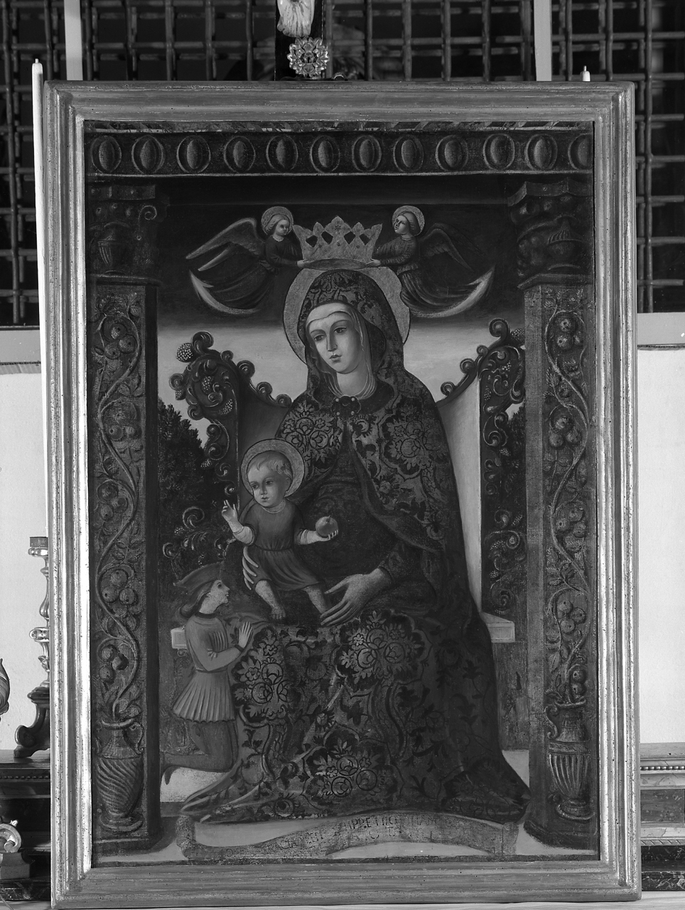 La Vergine, con manto nero decorato a motivi floreali dorati, siede su di un trono; il Bambino indossa tunica rossa e tiene con la mano sinistra una mela. Sulla sinistra è un personaggio inginocchiato, forse il committente. In alto due piccoli angeli sorreggono una corona sul capo della Madonna