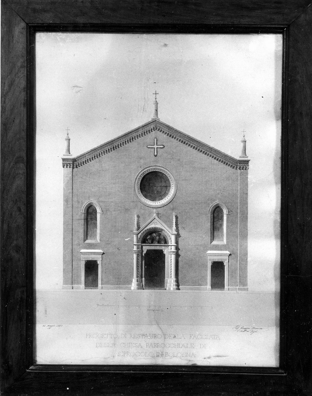 - NOTIZIE STORICO CRITICHE Come afferma la scritta si tratta del progetto di sistemazione della facciata della chiesa di San Procolo, presentato da Giuseppe Modonesi nel maggio del 1880. Esso si riferisce al restauro portato a termine nel 1883, secondo criteri di "ripristino" tipici dell'epoca che portano all'aggiunta dei tre pinnacoli alla sommità, all'apertura dell'oculo centrale in luogo di una finestra rettangolare seicentesca, alla sistemazione delle due finestre laterali a monofora gotica e del coronamento del portale centrale a cuspide. All'ingegnere Giuseppe Modonesi si deve anche, in Bologna, la sistemazione della facciata della Chiesa di San Martino (1879)