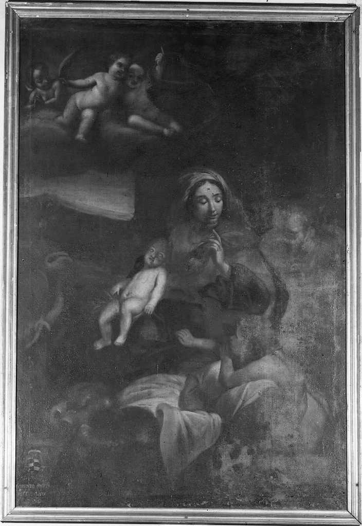 Al centro del quadro vi è raffigurata la Vergine, seduta, in atto di scrivere. La mano sinistra, infatti, regge una penna, mentre la destra funge contemporaneamente da sostegno al Bambino addormentato (di piccole proporzioni) e a un libro aperto, che viene sfogliato anche dal S. Giovannino. Dietro la Madonna si scorge la figura di S. Giuseppe. In alto, a sinistra, tre putti tra le nuvole: uno regge una palma e l'altro una fascia con iscrizione