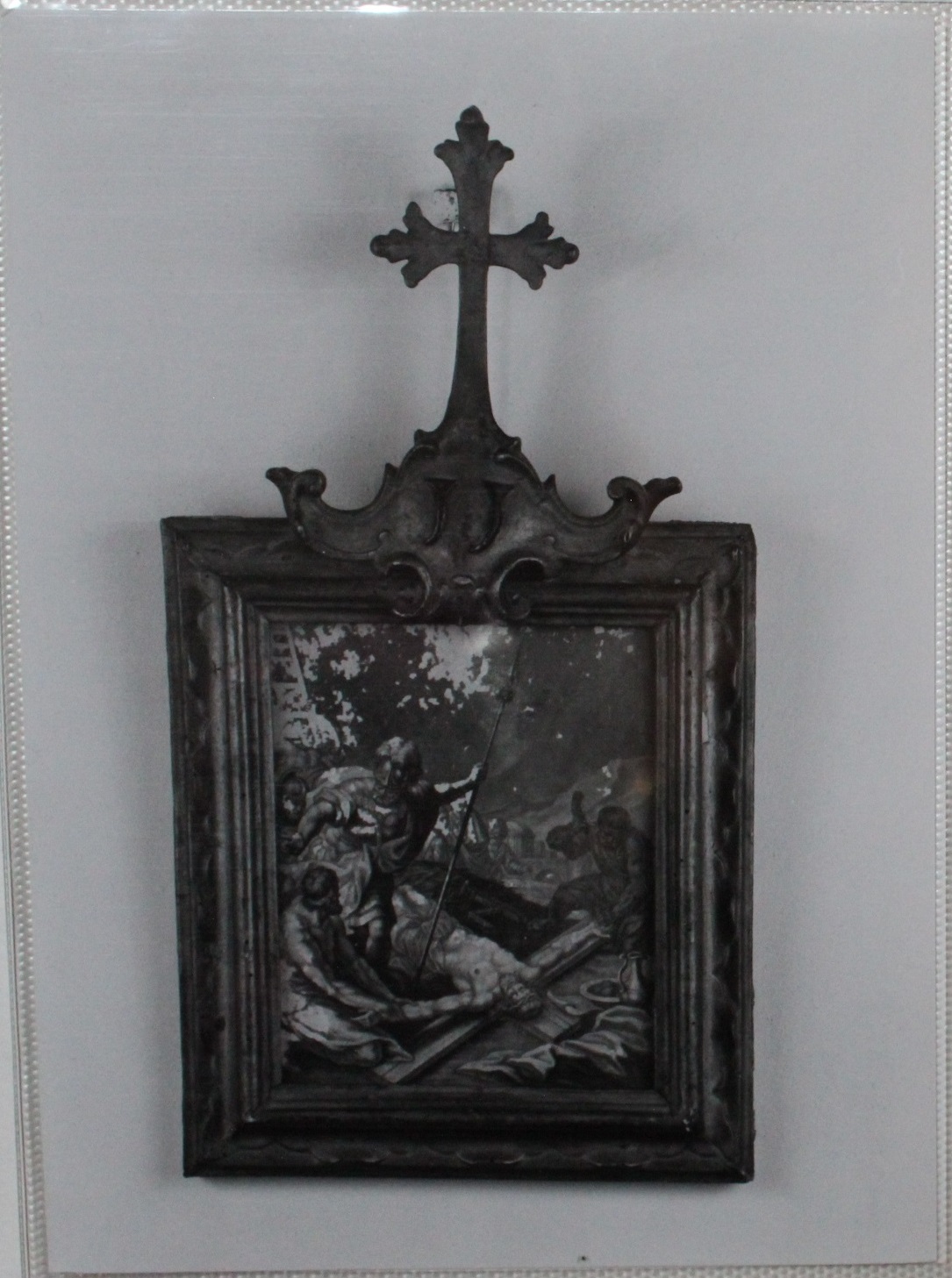 Personaggi: Gesù Cristo; soldati romani; aguzzini. Attributi: (Gesù Cristo) croce; corona di spine. Oggetti: brocca; bacile; lancia; scala. Abbigliamento all'antica. Paesaggio