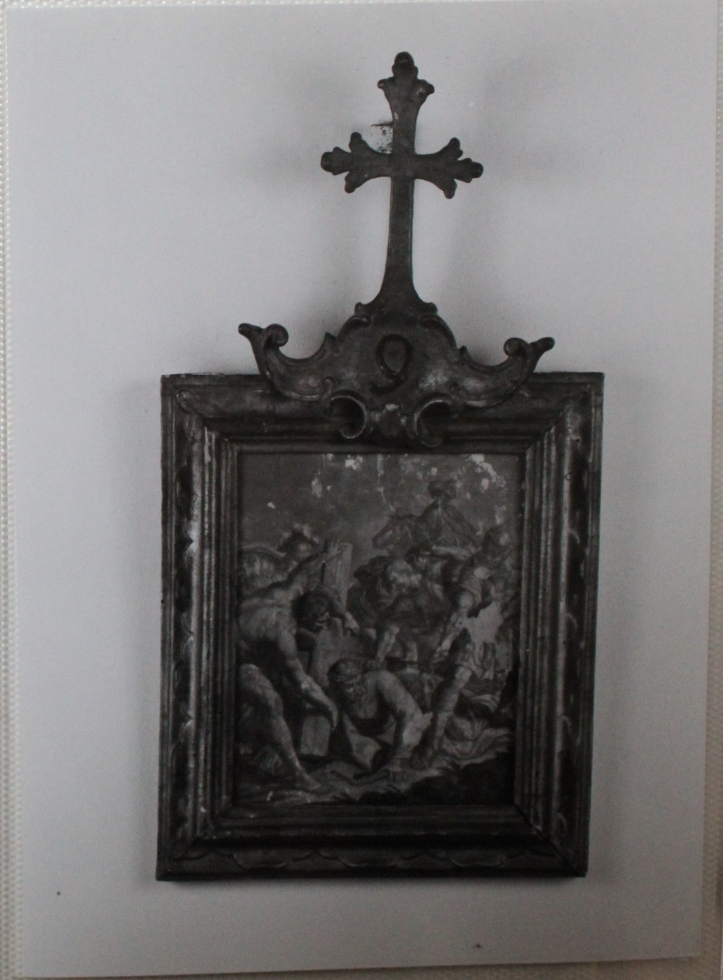 Personaggi: Gesù Cristo; soldati romani; ebreo. Attributi: (Gesù Cristo) croce; corona di spine. Oggetti: verga; corde. Abbigliamento all'antica