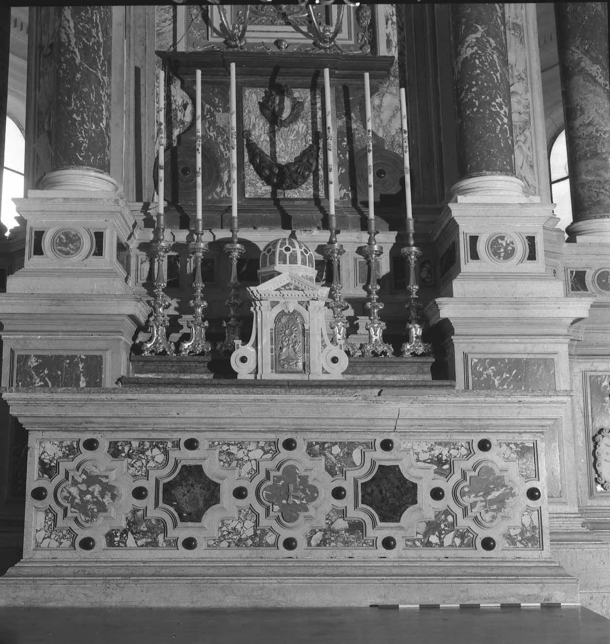- NOTIZIE STORICO CRITICHE La mensa appartiene al sontuoso complesso marmoreo, comprendente l'ancona e le porte laterali (cfr. scheda n. 08/00017971), eretto per volontà testamentaria del 1674 di Claudia Scotti vedova di Carlo Rondinini, morta nel 1678. La commissione fu affidata al veneziano Cavalieri (rogito del 24 aprile 1679). Il tabernacolo originale si trova attualmente sull'altare di crociera destro nella chiesa di S. Maria dell'Angelo (o Santa Maria Nuova) già dei Gesuiti