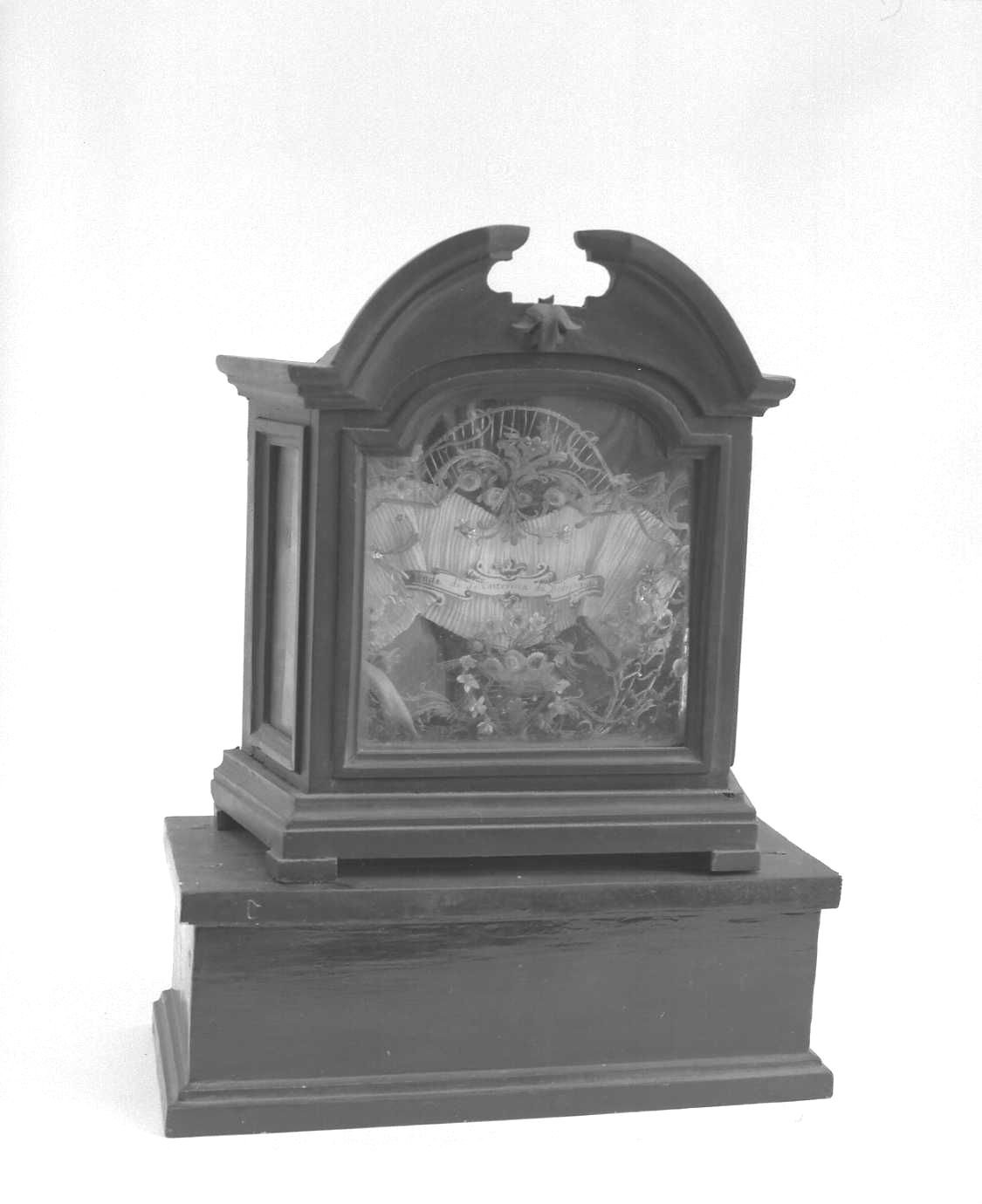 In legno dipinto di nero. Su quattro peducci angolati che reggono la cornice inferiore modanata. Apertura frontale vetrata a centina ribassata; sui lati è rettangolare. Breve cimasa ad arco spezzato, con foglia centrale sulla quale poggia la croce a bracci trilobati; sui lati cornice plurimodanata. Supporto quadrangolare a parallelepipedo, liscio, fra cornici aggettanti (8.5x23x11)