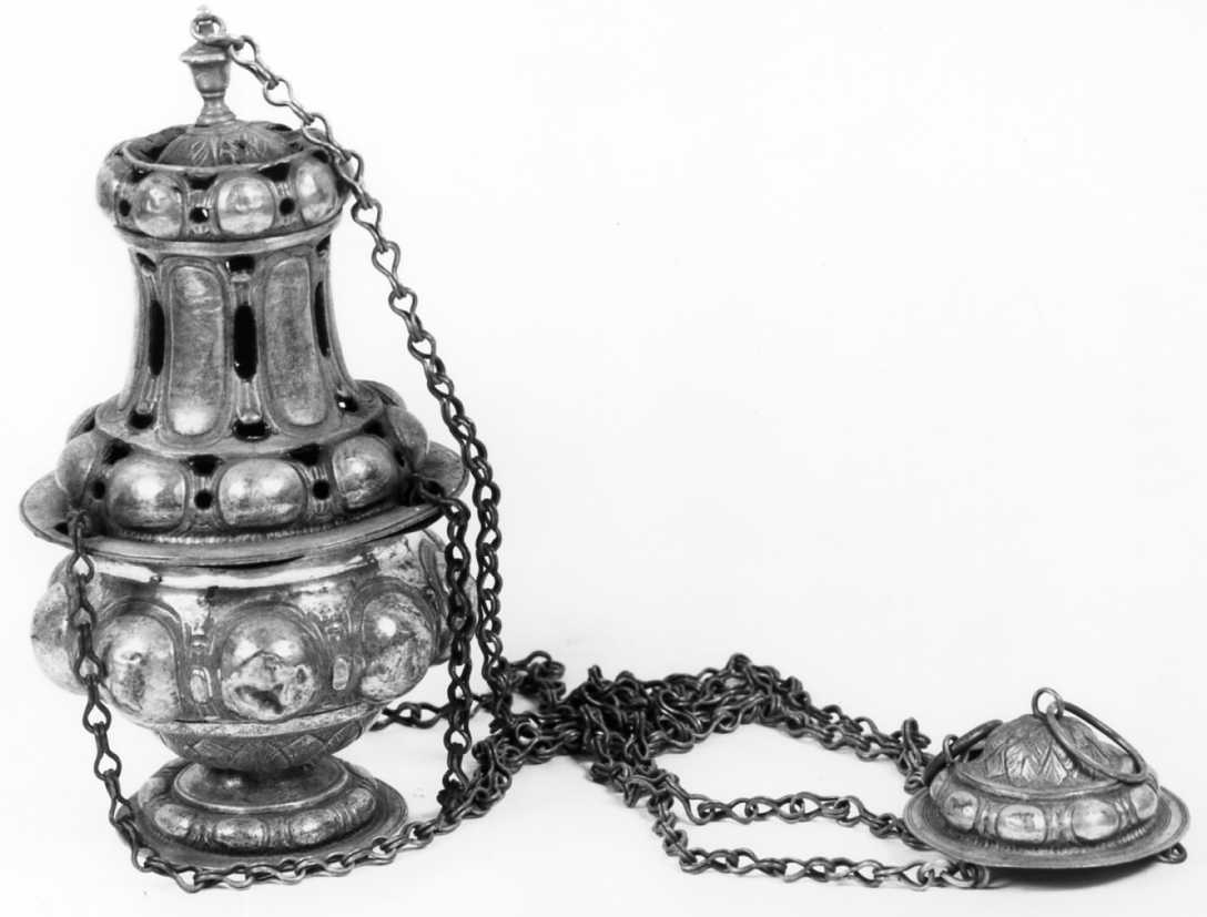 - NOTIZIE STORICO CRITICHE Il turibolo, di linea assai semplice e decorato con ornati diffusi, appare opera di pregio, affine agli esemplari, per esempio, della bottega bolognese dei Gambari