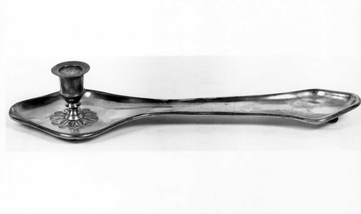 Manico e piattello sono fusi in unica soluzione, entrambi sagomati a losanga e a fondo ribassato. Il bossolo a piccolo vaso è impostato su corolla rilevata, con anello zigrinato e orlo aggettante liscio