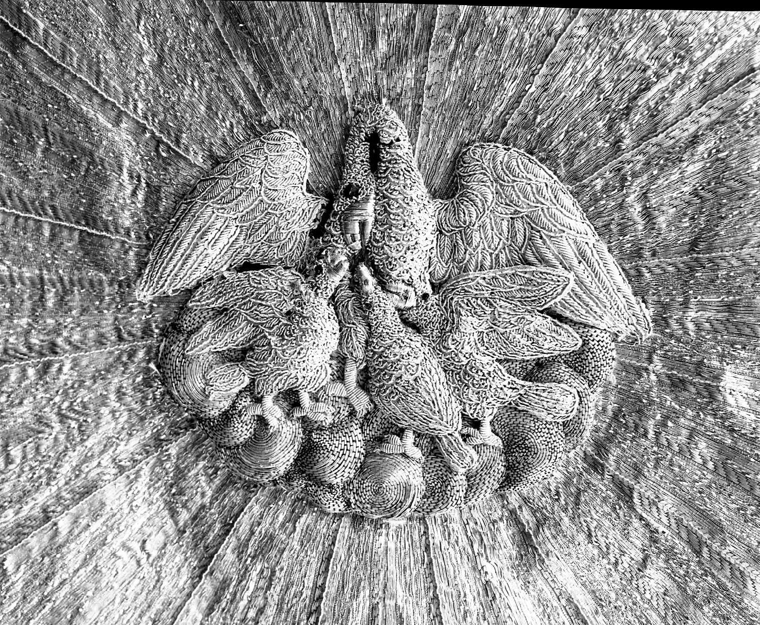 Fondo gros de Tours di colore avorio ricamato in oro filato, riccio e lamellare a punto steso e a punto pieno. Applicazioni di lustrini. Il decoro è costituito da volute fitomorfe intrecciate a fiori fantastici, fregi geometrici, palme a conchiglia, larghi campi lavorati a losanghe, raccordate da fioretti o arricchite da lustrino centrale. Al centro, una grande e fitta raggiera d'oro, circondata da ghirlanda di pampini e grappolii d'uva, racchiude il simbolo del pellicano che nutre i suoi piccoli, ricamato a forte rilievo in argento e applicato. Fodera in seta rosso cremisi; gallone a fuselli in oro filato