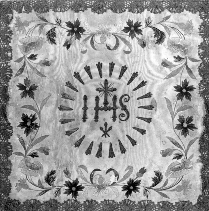 Fondo taffetas prodotto da un ordito e da una trama di seta di colore avorio. Ricamo in sete policrome: cornice continua formata da stelo sottile e ondulato che lega fioretti sfumati a punto raso; raggera centrale in cordoncino d'oro con monogramma IHS con croce e chiodi. Gallone a fusell in oro filato. Fodera viola