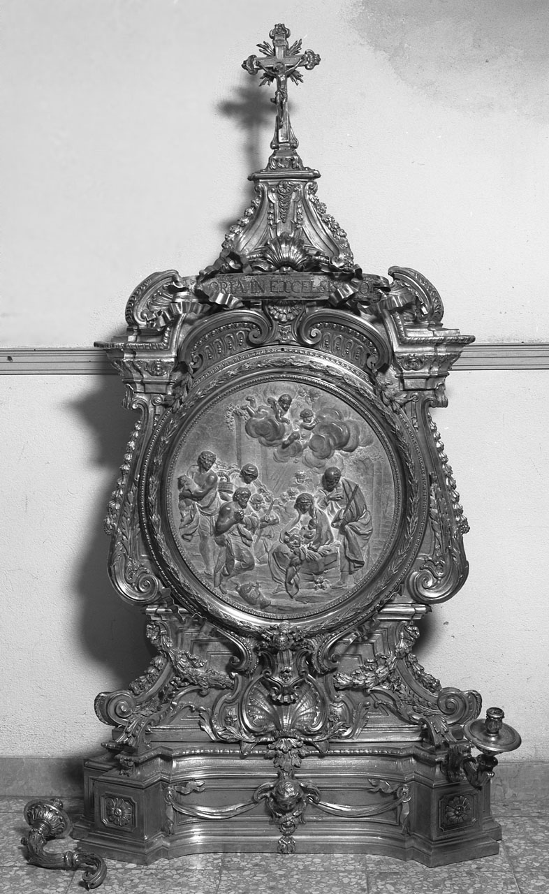 Rilievo in argento sbalzato: a ds. siede la Vergine su una mangiatoia, reggendo in braccio il Bimbo ignudo volto a sin. verso i pastori, due dei quali portano animali, mentre una donna in piedi tiene un cesto con colombe. Dietro è San Giuseppe, la mano ds. al petto e la sinistra che regge manto e bastone. A terra, in primo piano è legata una pecora. Figure e putti e in alto, cherubini e angioletti fra nubi