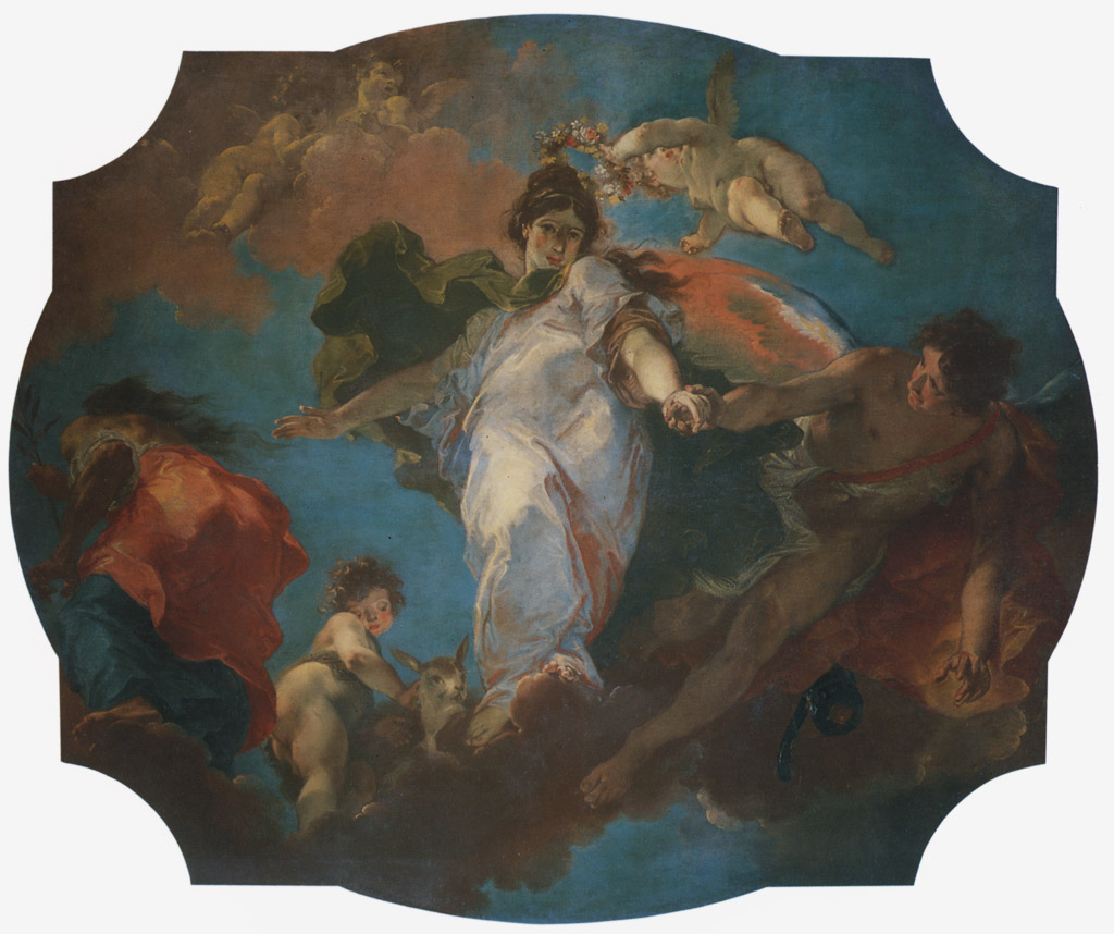 - NOTIZIE STORICO CRITICHE Già conosciuta come Allegoria della Verità, la tela, proveniente da un soffitto di Palazzo Massarani a Mantova, fu probabilmente commissionata in occasione di nozze famigliari (Ottani Cavina 1984). Il taglio con l'audace sottoinsù, l'impaginazione complessiva della scena ed il pastoso cromatismo di matrice rubensiana-veneta, fanno dell'opera un felice esempio di rococò italiano. La cronologia proposta, circoscritta alla metà del XVIII secolo, è tratta da TELLINI PERINA 1966