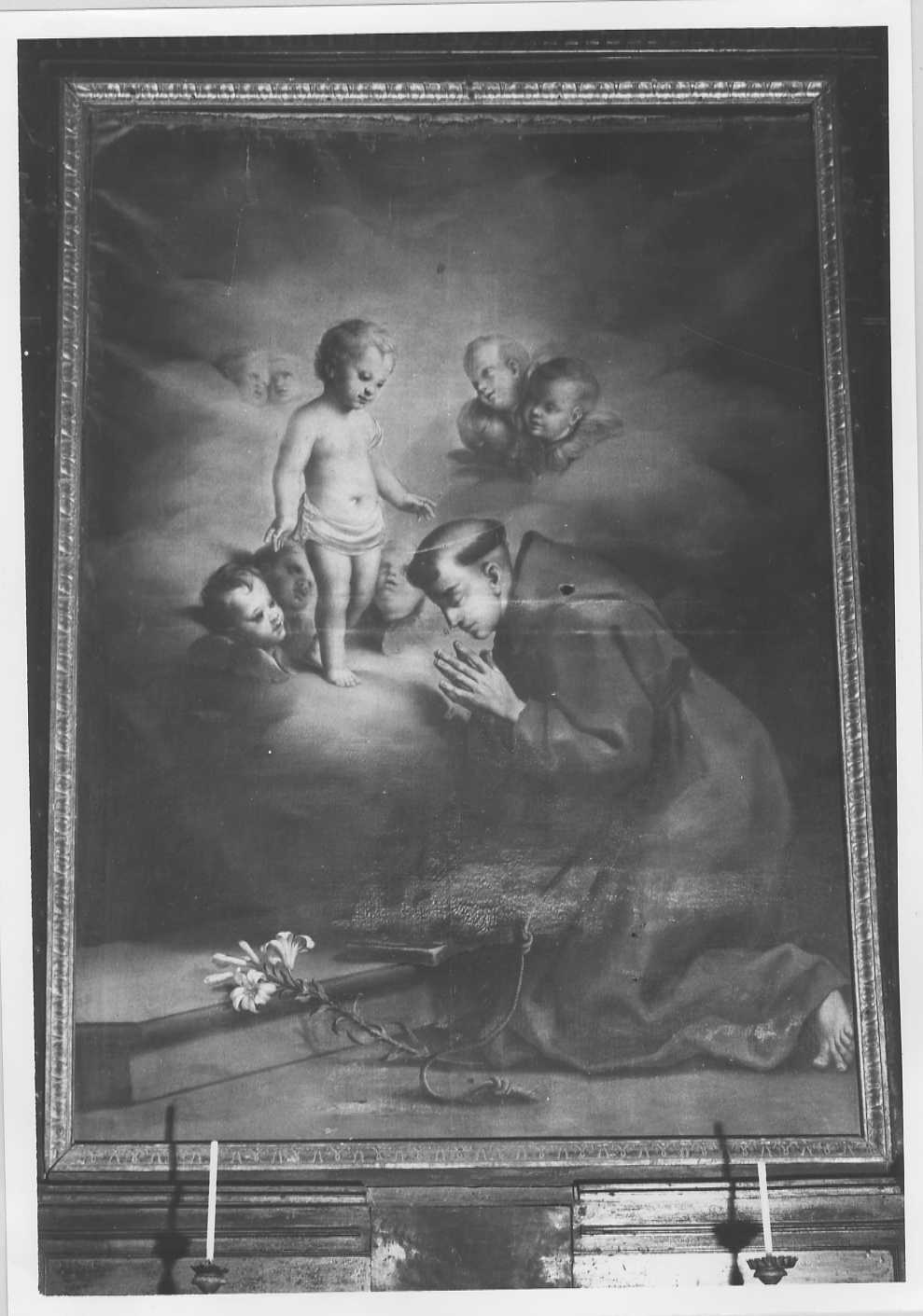 Il santo è in ginocchio, di profilo verso sinistra, e prega, chino, innanzi al Bimbo Gesù che gli appare in piedi su nube tra cherubini. Su un gradino sono un libro e un giglio