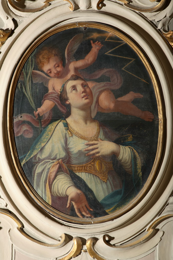 Dipinto di forma ovale con mezza figura della Santa in veste bianca a motivo dorato e ricco manto verde, con lo sguardo rivolto al cielo; la mano sinistra è al petto, la destra è aperta a mostrare una stimmate. Sul capo della martire un angelo in volo regge in mano la palma; a destra in alto un fulmine