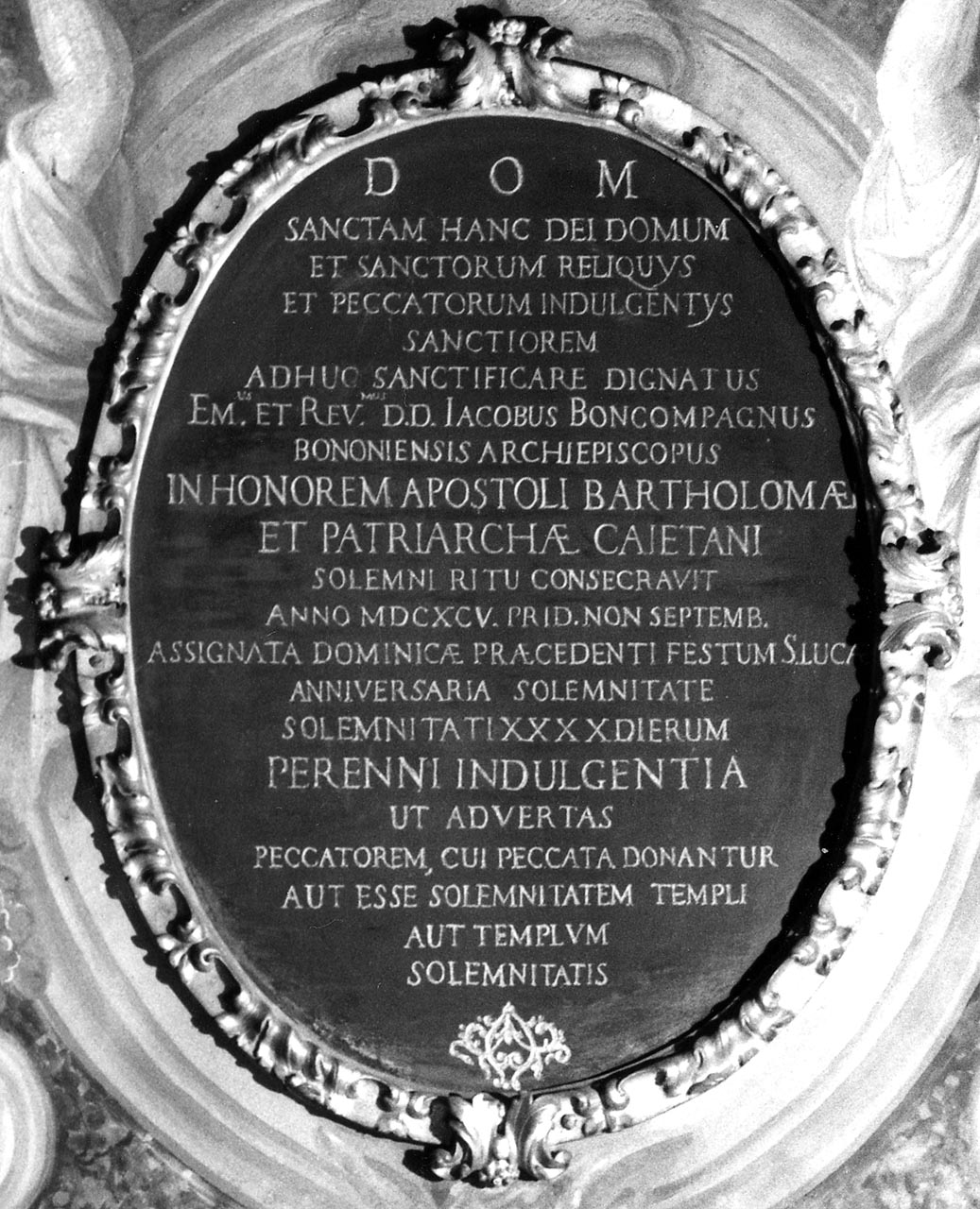 Decorazione policroma su campi mistilinei a finto marmo: una grande mensola regge due volute che portano due figure femminili opposte, cui si avvolgono due festoni di fiori e frutti, che sopportano la trabeazione curvilinea a cornice, con testina centrale alata sovrastata da vaso con festoni e due vasi fiammati alle estremità. Al centro, apertura ovale con lapide a fondo nero con epigrafe