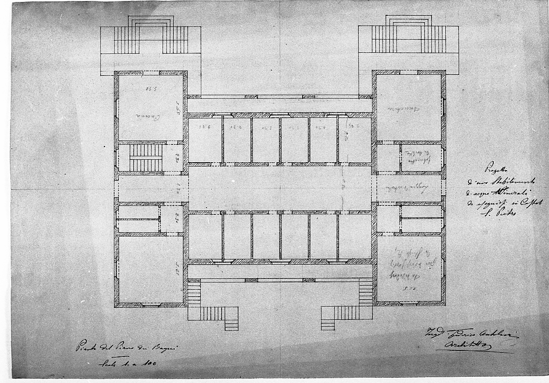 Matita su carta color bianca ingiallita. Penna, inchiostro nero. Pianta del piano terreno di un edificio termale. Il vano centrale, sopraelevato e pertanto collegato ali piano di calpestio con due rampe di scale sui due fronti, è composto da un lungo corridoio sul quale si fronteggiano piccole stanze. Dai lati corti si accede alle ali laterali, lunghe e strette, anch'esse con ambienti uguali e distribuiti simmetricamente