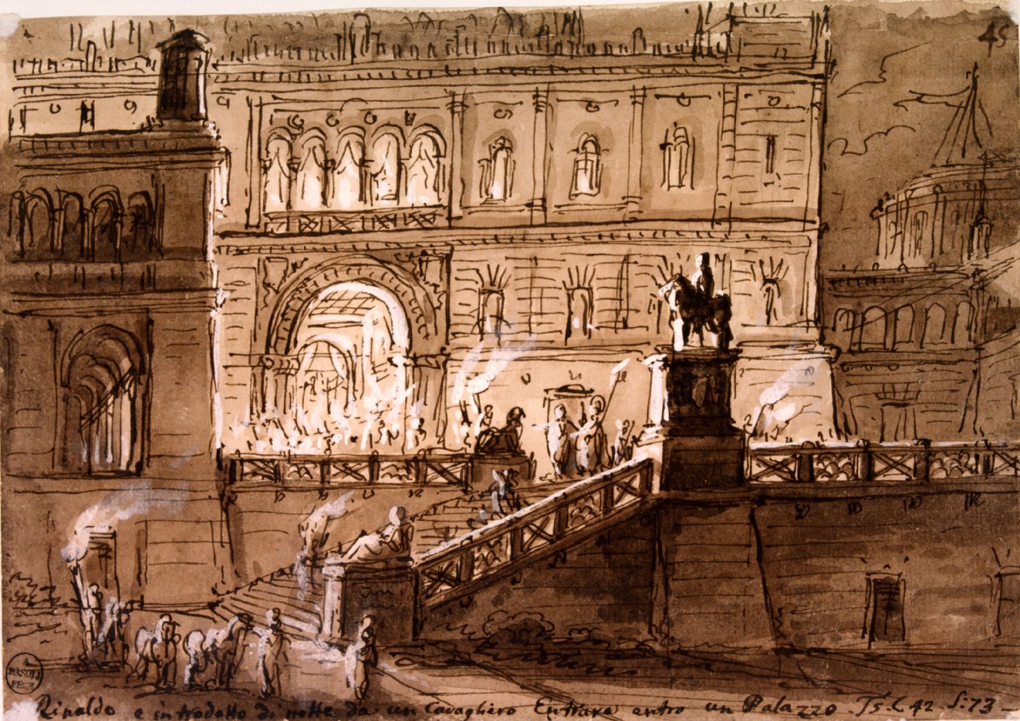 - ISCRIZIONI in basso - SELVA DI ARDENA RINALDO SI BATTE COL MOSTRO - ARIOSTO T 5 C 42 S 45-46 - Basoli Antonio - corsivo - a penna -