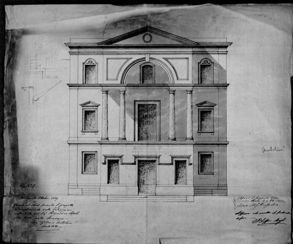 - NOTIZIE STORICO CRITICHE Secondo quanto si desume dalla scritta autografa dell'autore, il disegno rappresenta la facciata nord della palazzina della villa di Alessandro Ascoli che si trova a Bologna fuori porta Saragozza. Il progetto reca la data "11 ottobre 1889". Si presenta tracciato in modo estremamente semplice e i l chiaroscuro viene reso con un segno un po' incerto.Il disegno fu acquist ato dalla Pinacoteca Nazionale di Bologna da Antonio Linari, collezionista bolognese di progetti architettonici di vari edifici della città. L'anali si dei documenti amministrativi conservati nell'archivio della Pinacoteca permette di riconoscere la descrizione del disegno e stabilirne così l'esa tta provenienza (cfr., tesi di laurea di Roberta Serra, Università di Bologna, a.a. 1998, -1999, relatore Anna Forlani Tempesti)