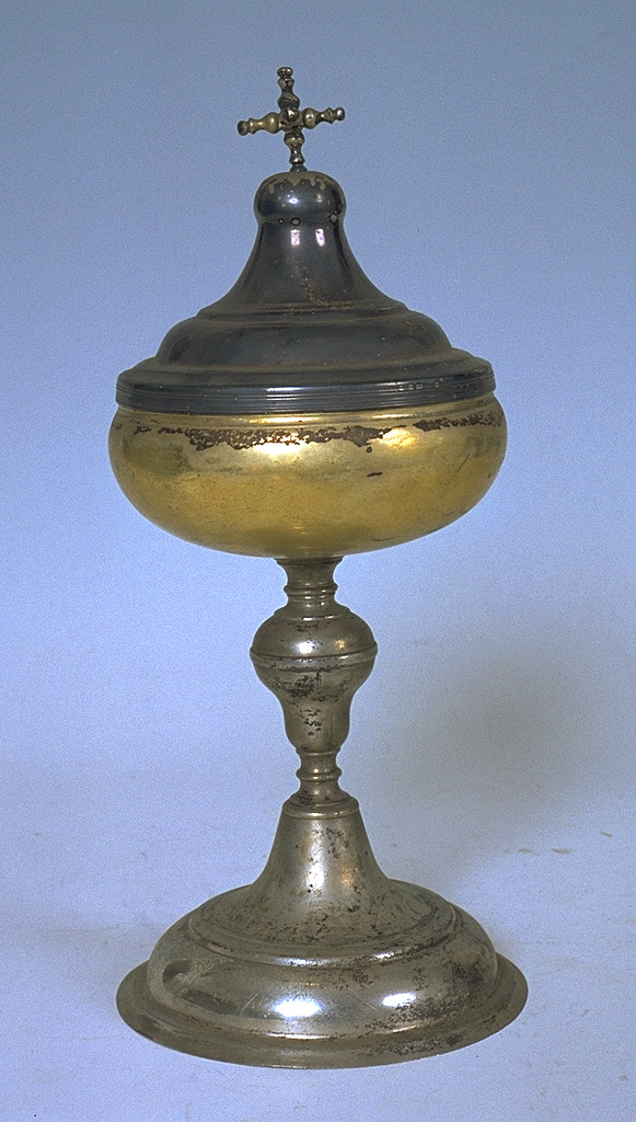 Piede circolare, bombato, privo di decorazioni. Fusto con nodo strozzato, coppa molto bombata. Coperchio sagomato, sormontato da una crocetta