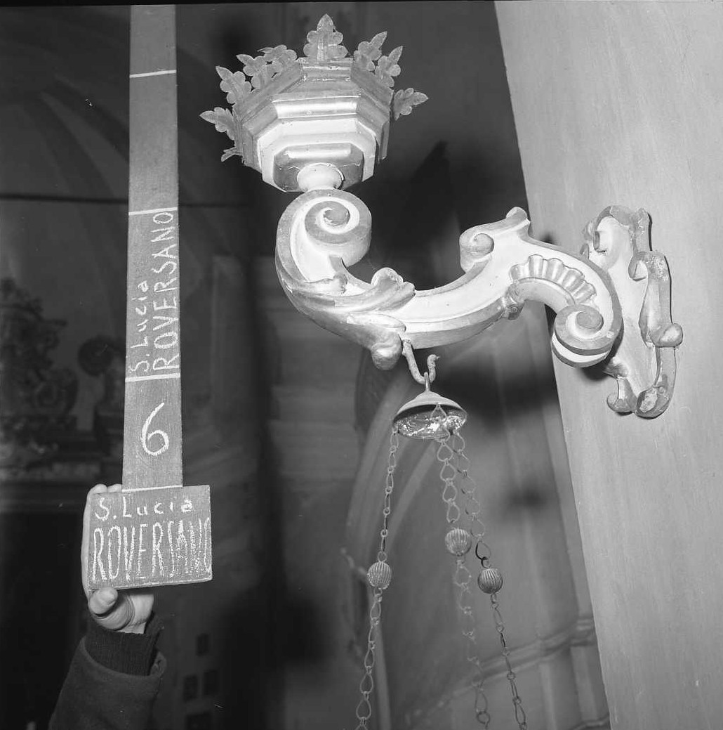 Da un pannellino d'attacco nel muro ad andamento mistilineo parte il braccio mosso a volute che sostiene in alto il piano poggiacandela a più fasce