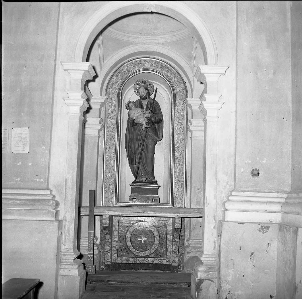 Due mensole dipinte a finto marmo rosa ai lati inquadrano un pannello centrale con tondo a finto marmo azzurro con croce dorata. La mensa è sovrastata da una nicchia di linee semplici con arco superiore semicircolare, con cornici perimetrali dorate ai lati e specchiatura interna dipinta a finto marmo grigio