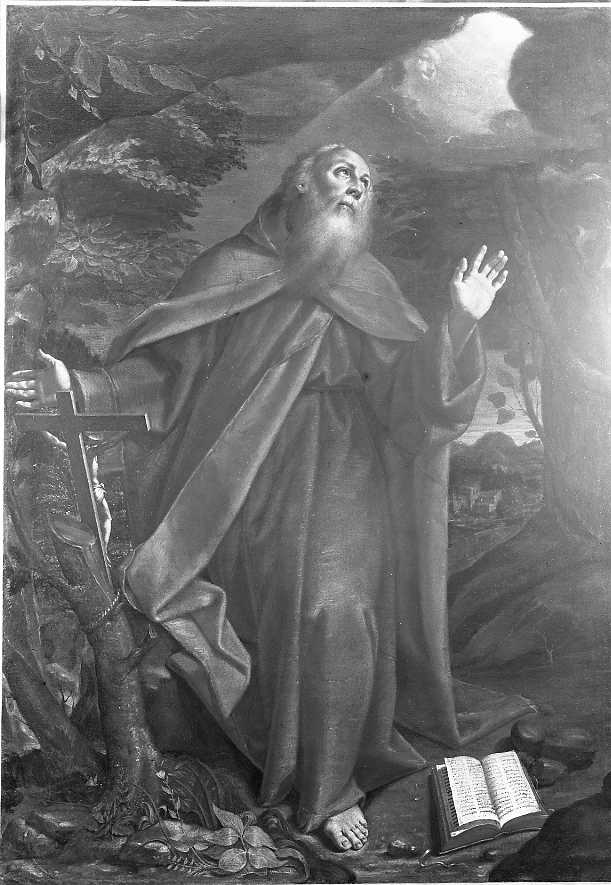 Figura intera, in piedi, volta a destra, con le braccia aperte, in contemplazione del cielo che si intravede luminoso fra nuvole nere. In terra è piantato un piccolo crocifisso, e vicino giace un libro aperto. Ai piedi del Santo la fiamma simbolica