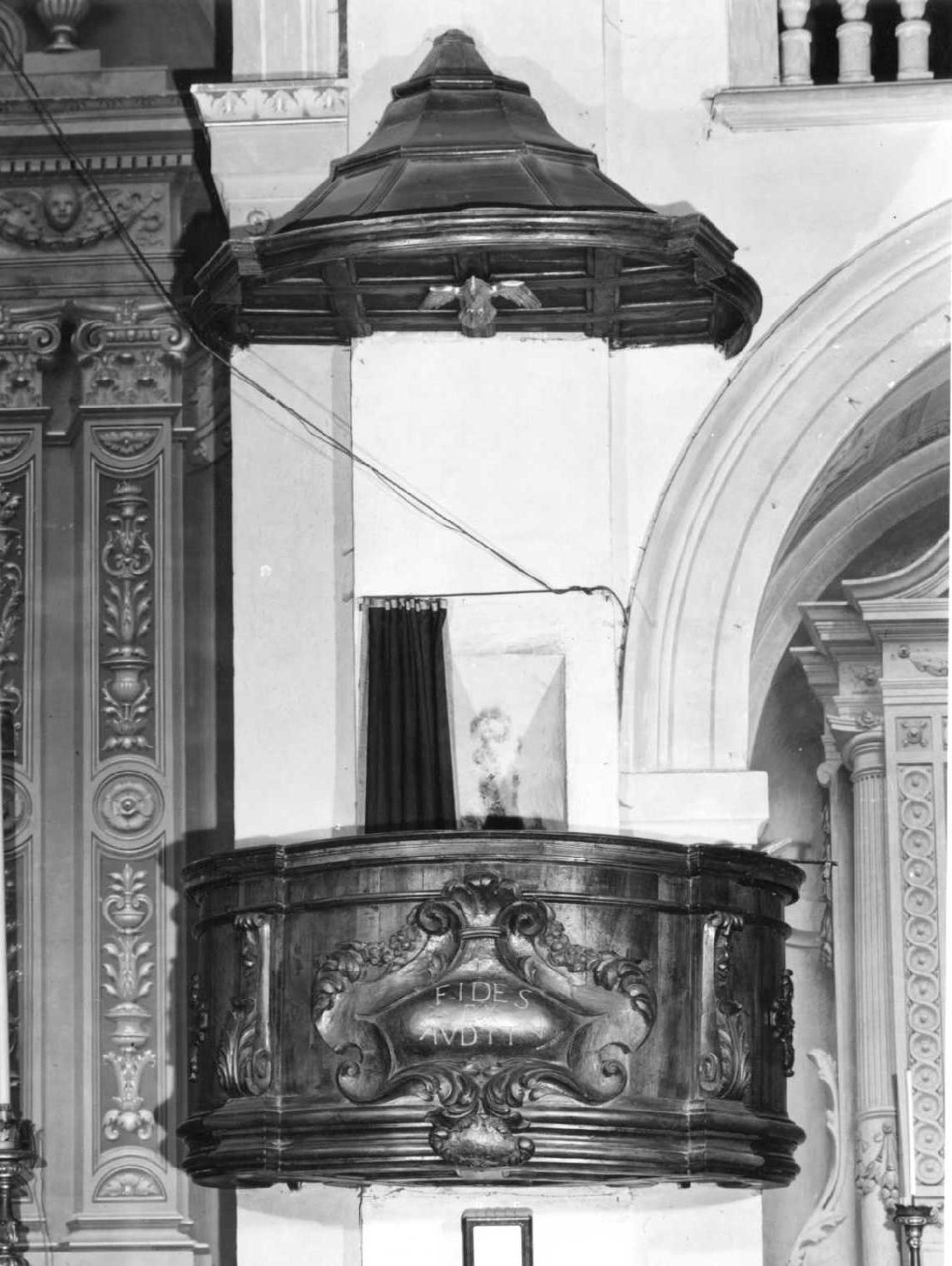 Il pulpito ha un baldacchino, pure in legno di noce, con fregi intagliati sempre di legno e applicati