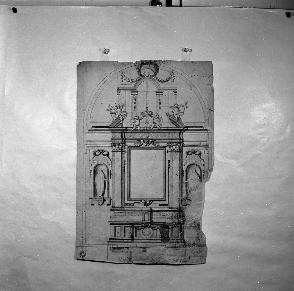 Disegno a penna nera, acquerello rosa e giallino, tracce di matita nera su carta verdina rappresentante un altare con due nicchie laterali e statue dentro e, in alto, sulle cornici, quattro angioletti