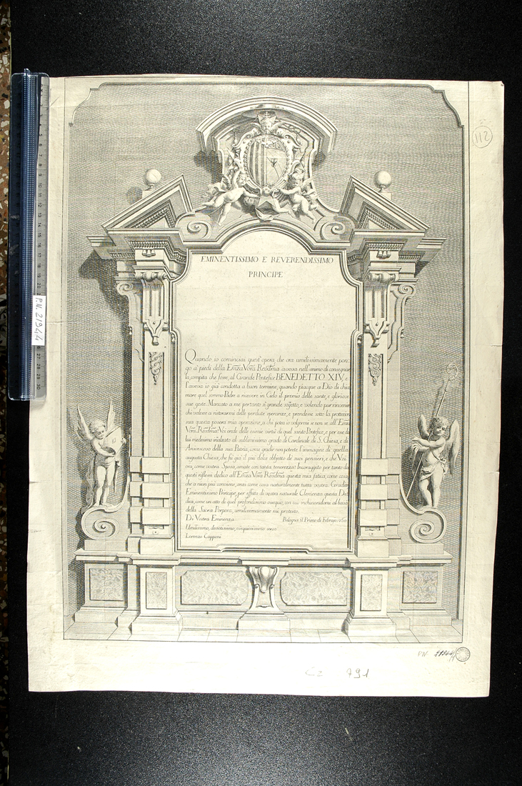 - NOTIZIE STORICO CRITICHE La stampa si lega al Pn 21944/ 2, NCTN 00083518: entrambe si trovano sul medesimo foglio, l'una sul recto e l'altra sul verso, pur essendo fra loro indipendenti. Il dedicatario dell'opera è stato identificato tramite stemma nel cardinale Vincenzo Malvezzi Bonfioli, bolognese, creato da Benedetto XIV nel novembre del 1753, e divenuto poco dopo, all'inizio del 1754, arcivescovo di Bologna, cariche mantenute fino alla morte avvenuta nel 1775. Lorenzo Capponi, attivo a Bologna in quegli anni, eseguì per il pontefice Benedetto XIV un'opera, dedicandola poi al cardinal Malvezzi Bonfioli alla morte del destinatario, come informa l'iscrizione, opera di cui questa stampa doveva verosimilmente costituire il frontespizio