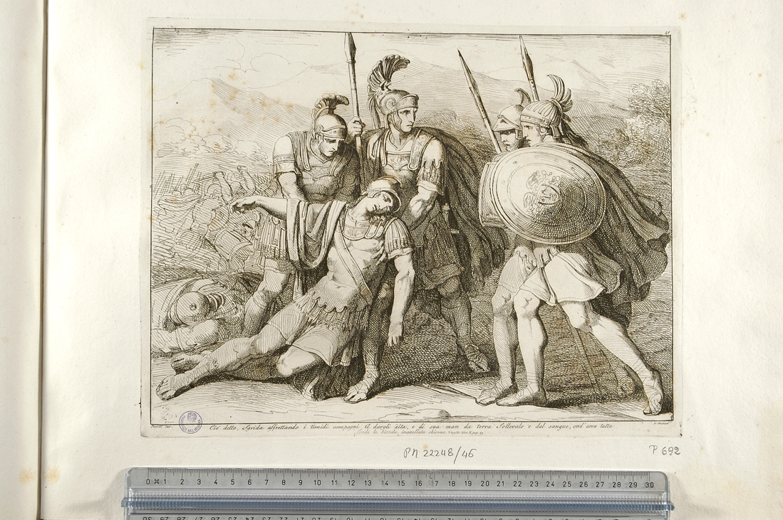 Personaggi: Lauso. Figure: soldati; cadaveri. Armi: lance; scudi. Paesaggi: paesaggio con montagna
