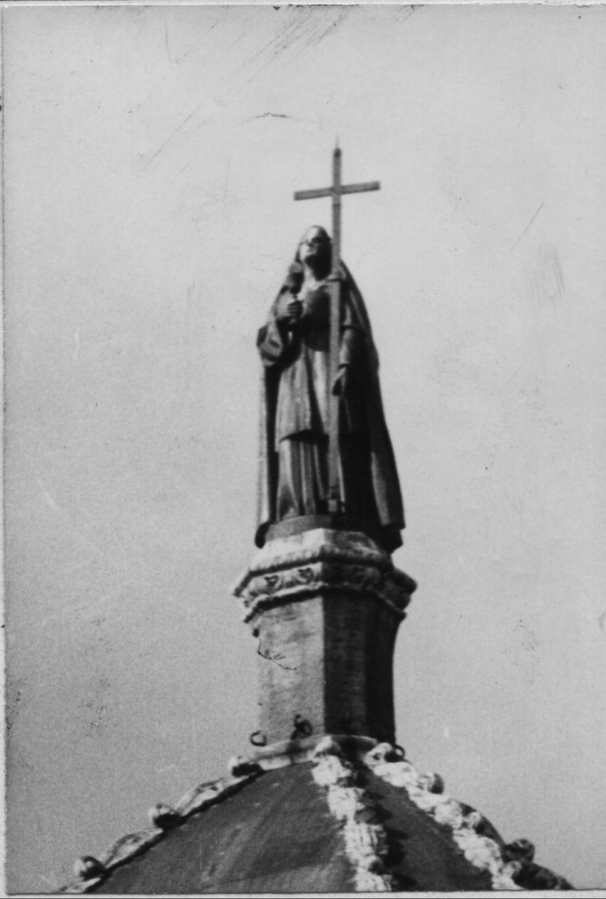 A tutto tondo, eseguita in rame martellinato e fuso. La Fede, in figura di donna, ammantata, regge una croce ed il calice