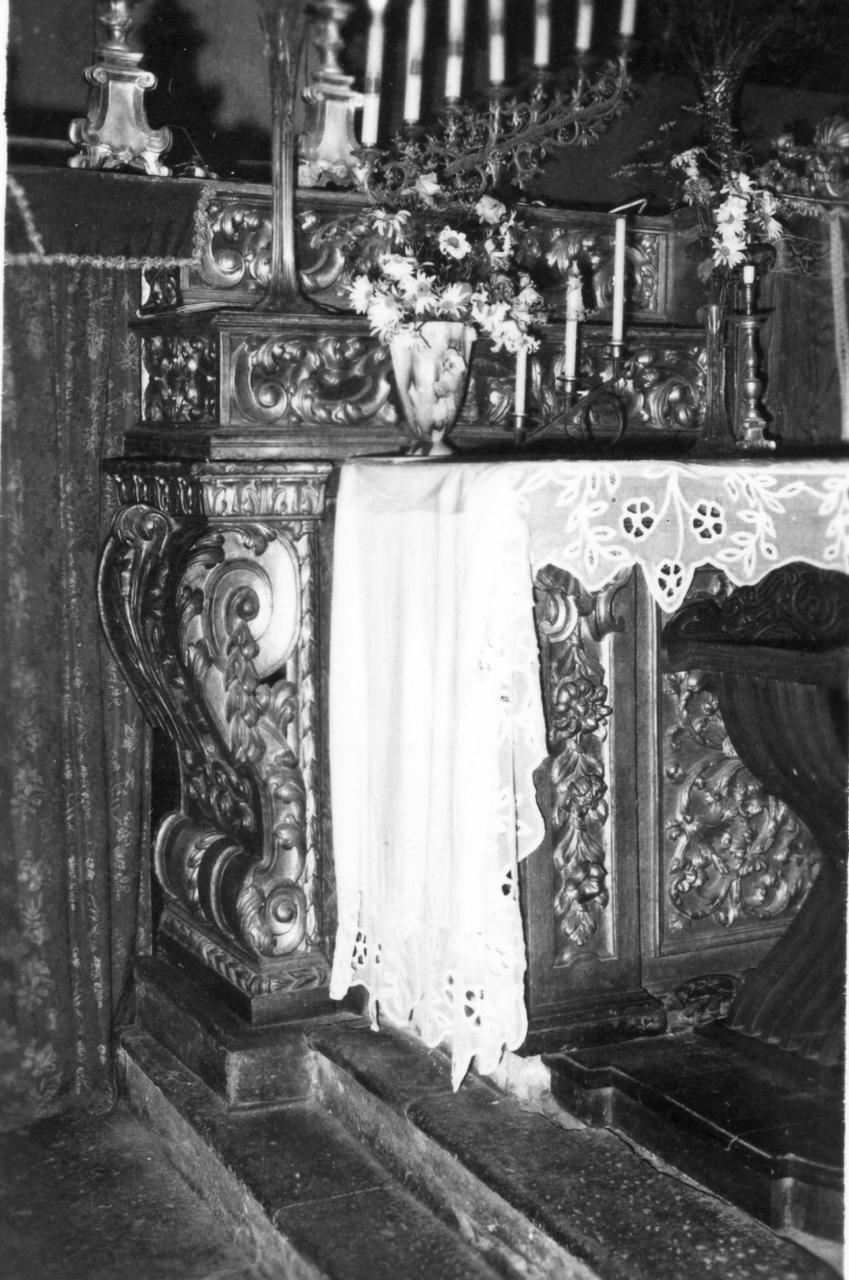 Dipinto in rosso. Struttura a mensoloni arricciati, fittamente ornati in bassorilievo con racemi, festoni di foglie e fiori, reggenti due ripiani interrotti, al centro, dal tabernacolo; paliotto fittamente ornato, sempre in bassorilievo. La parte posteriore è dipinta