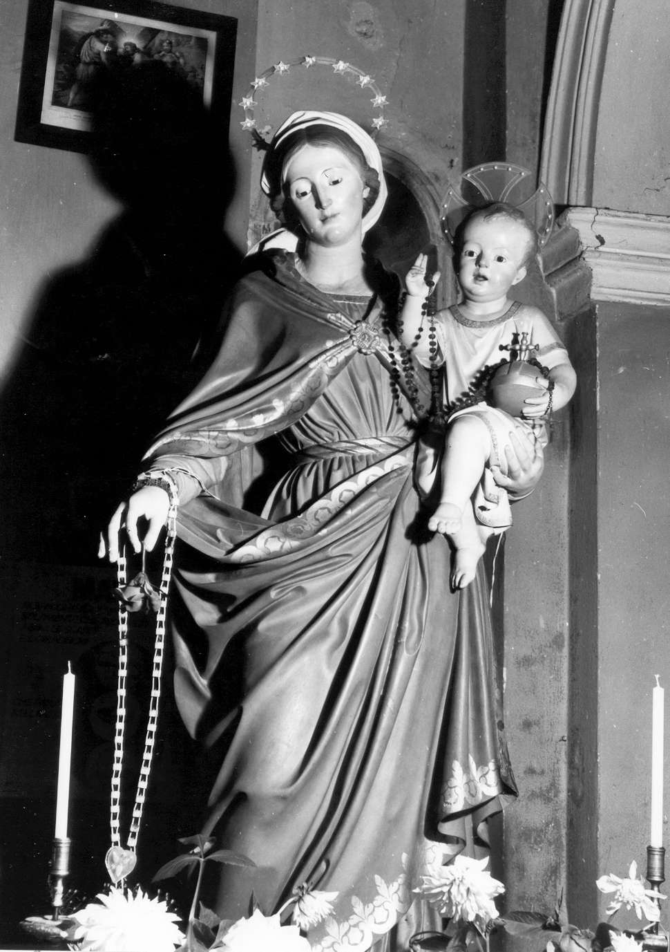 La Madonna, con tunica rossa e manto azzurro con bordi a fregi dorati, regge il piccolo Gesù benedicente, vestito con tunica bianca con bordi dorati