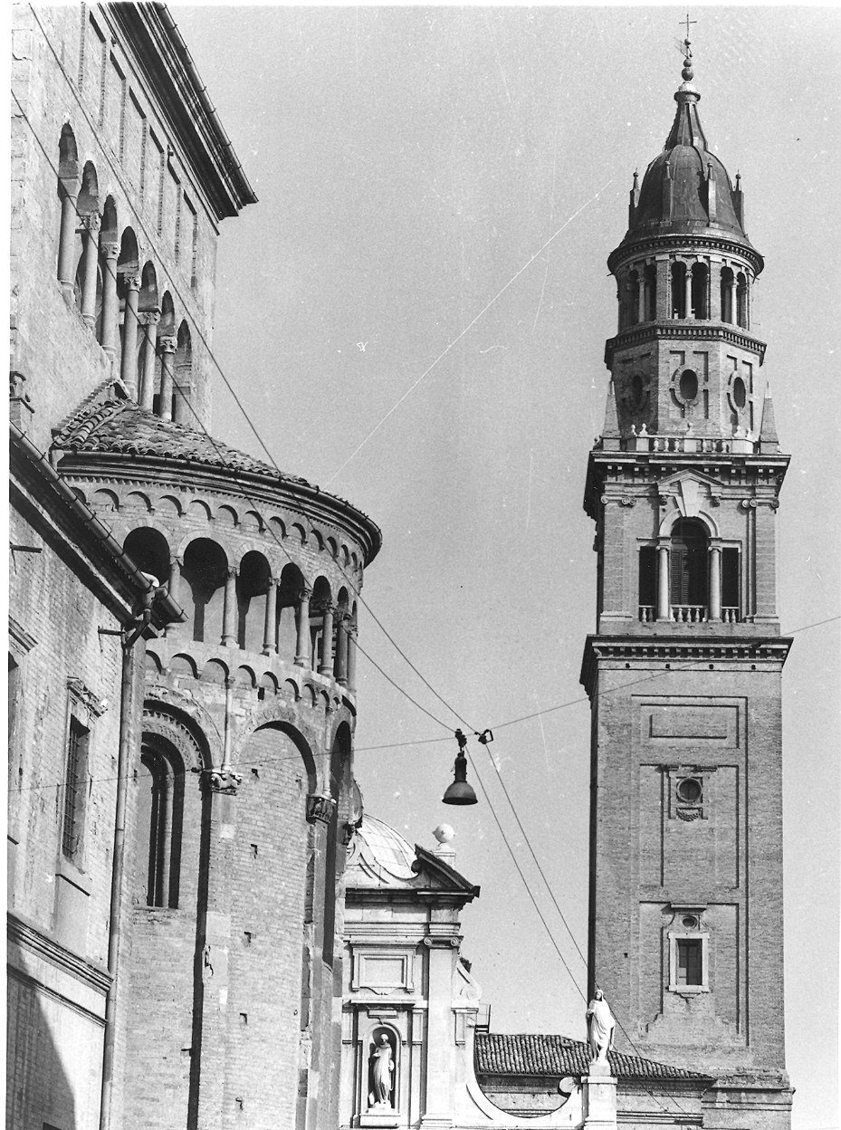 - NOTIZIE STORICO CRITICHE Come risulta dalle iscrizioni riportate, la torre venne eretta a partire dal 1614 fino al 1618 sulle rovine della vecchia. La commissione fu dell'abate Benedetto Ceresa, ma dai documenti non è possibile ricostruire la storia progettuale del campanile. Senza dubbio è da escludersi come possibile autore il Moschino per ragioni stilistiche e per le ovvie ripercussioni nate dallo scalpore suscitato dalla sua facciata. Secondo Bruno Adorni (1979) non è esatto neppure il nome proposto da alcuni di Pier Francesco Battistelli, artista presente a Parma solo dal 1618. Egli propone come autore Giovan Battista Magnani dal momento che questi lavora per il convento di S. Paolo dal 1613 e nel 1622 costruirà la chiesa di S. Alessandro, opere entrambe per le monache benedettine dipendenti.dall'abate di S. Giovanni. Tale attribuzione trova peraltro conferma stilistica nel confronto con queste sue opere documentate. Secondo Ghidiglia Quintavalle in questo campanile confluiscono due tendenze; mentre nella parte inferiore domina la tradizione cinquecentesca, nella parte superiore prevale il Barocco (cfr. scheda precedente)