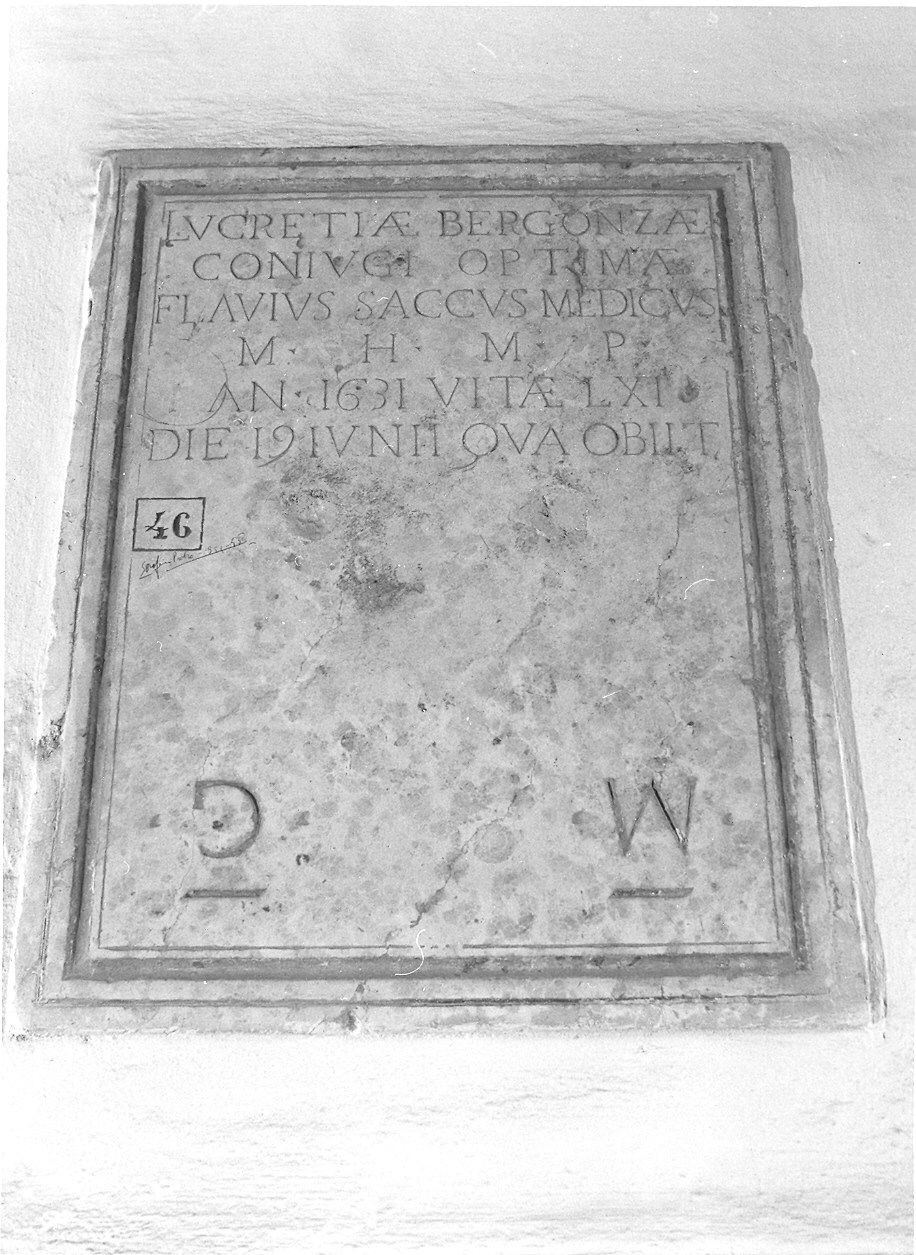 - ISCRIZIONI sulla lastra - LUCRETIAE BERGONZAE/ CONIUGI OPTIMAE/ FLAVIVS SACCVS MEDICVS/ M. H. M. P./ AN. 1621 VIAE LXI/ DIE 19 IVNII QVA OBIIT - lettere capitali - a incisione -