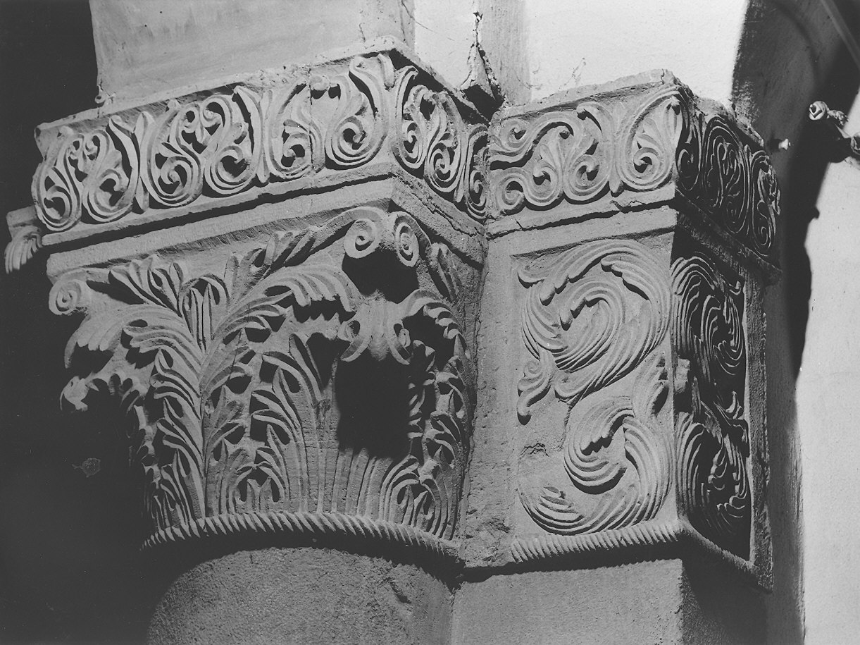 Capitello su emicolonna addossata a pilastro n. 1 est, decorato con un grande tralcio organizzato a fronde simmetriche desinenti a volute sugli spigoli. Sulla lesena angolare nord, tralcio a S rovecsiata. Collarino a cordoncino e abaco a palmette