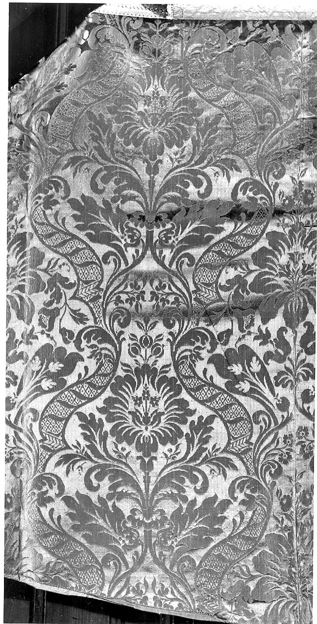 Disegno: si compone di grandi maglie ovali determinate da foglie d'acanto entro la qiale si apre un apiramide floreale con al centro un iris. Tessuto: damasco verde, fondo raso faccia catena, disegno raso faccia gros. Fodera di seta verde, gallone e trina d'argento filato e lamellare