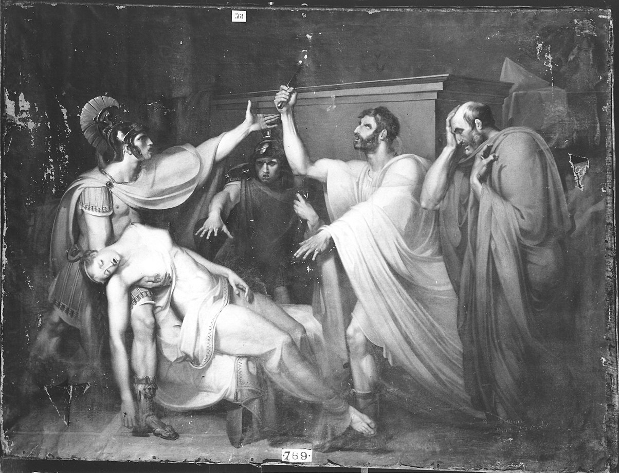 Personaggi: Aristodemo; Eumeo; figlia di Aristodemo. Figure: soldati. Armi: pugnale
