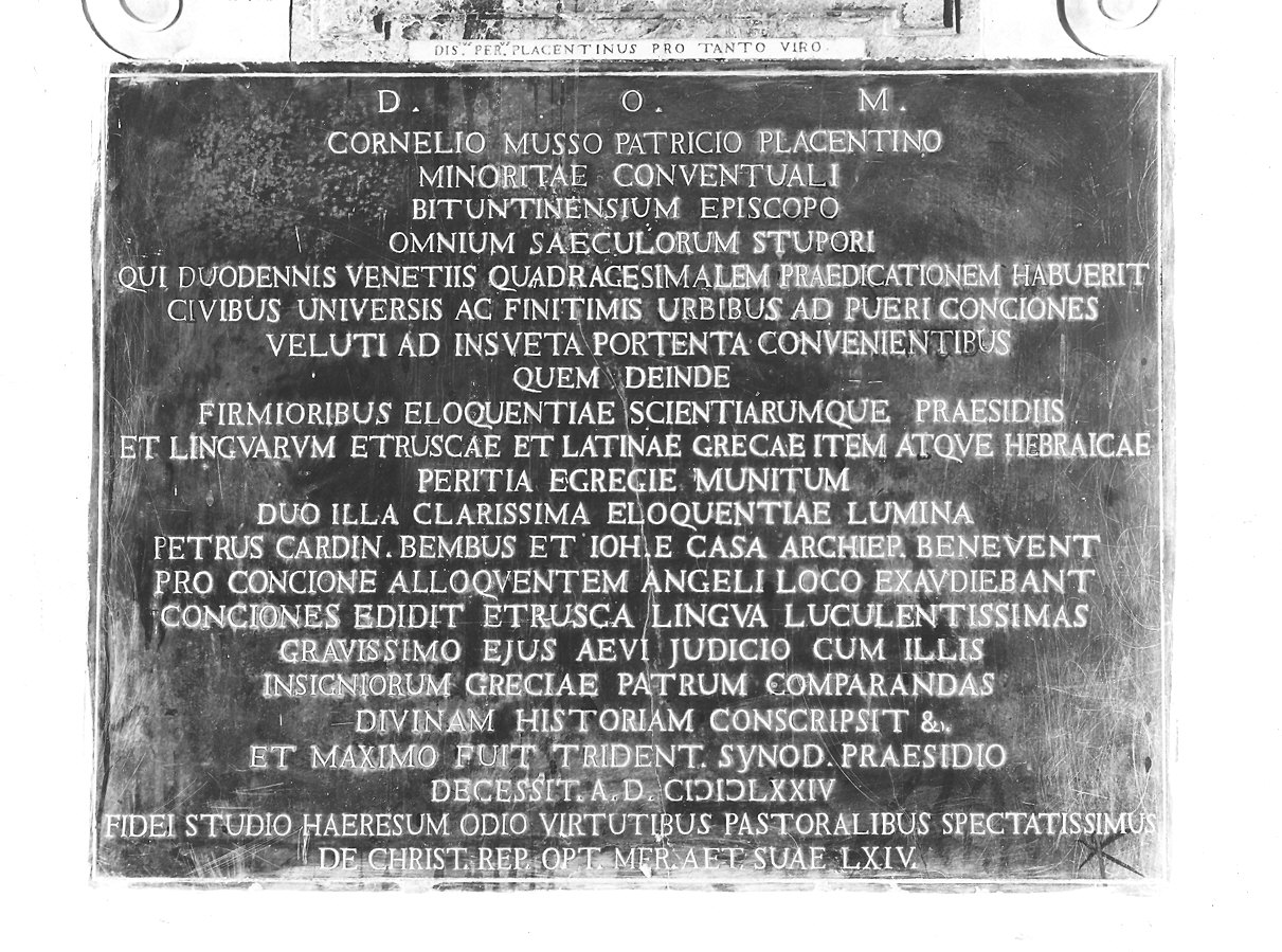 - ISCRIZIONI a tutto campo - D(EO) O(PTIMO) M(AXIMO)/ CORNELIO MUSSO PATRICIO PLACENTINO/ MINORITAE CONVENTUALI/ BITUNTINENSIUM EPISCOPO/ OMNIUM SAECULORUM STUPORI/ QUI DUODENNIS VENETIIS QUADRAGESIMALEM PRAEDICATIONEM HABUERIT/ CIVIBUS UNIVERSIS AC FINITIMIS URBIBUS AD PUERI CONCIONES/ VELUTI AD INSUETA PORTENTA CONVENIENTIBUS/ QUEM DEINDE/ FIRMIORIBUS ELOQUENTIAE SCIENTIARUMQUE PRAESIDIIS/ ET LINGUARUM ETRUSCAE ET LATINAE GRECAE ITEM ATQUE HEBRAICAE/ PERITIA EGREGIE MUNITUM/ DUO ILLA CLARISSIMA ELOQUENTIAE LUMINA/ PETRUS CARDIN(ALIS) BEMBUS ET IOH(ANN)E CASA ARCHIEP(ISCOPUS) BENEVENT(I)/ PRO CONCIONE ALLOQUENTEM ANGELI LOCO EXAUDIEBANT/ CONCIONES EDIDIT ETRUSCA LINGUA LUCULENTISSIMAS/ GRAVISSIMO EJUS AEVI JUDICIO CUM ILLIS/ INSIGNIORUM GRACIAE PATRUM COMPARANDAS/ DIVINAM HISTORIAM CONSCRIPSIT &/ ET MAXIMO FIUT TRIDENT(INO) SYNOD(O) PRAESIDIO/ DECESSIT A(NNO) D(OMINI) MDLXXIV/ FIDEI STUDIO HAERESUM ODIO VIRTUTIBUS PASTORALIBUS SPECTANTISSIMUS/ DE CHRIST(I) REP(UBICA) OPT(IME) MER(ITUS) AET(ATIS) SUAE LXIV - lettere capitali - a incisione - latino