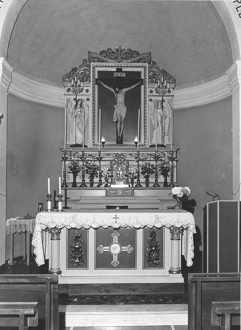 L'ancona è in legno laccato beige con decorazioni a volute e rosette dorate. Racchiude, entro riquadratura intagliata e dorata, un crocefisso in gesso e presenta una ricca cimasa con motivi, a traforo, di volute, riccioli e foglie d'acanto