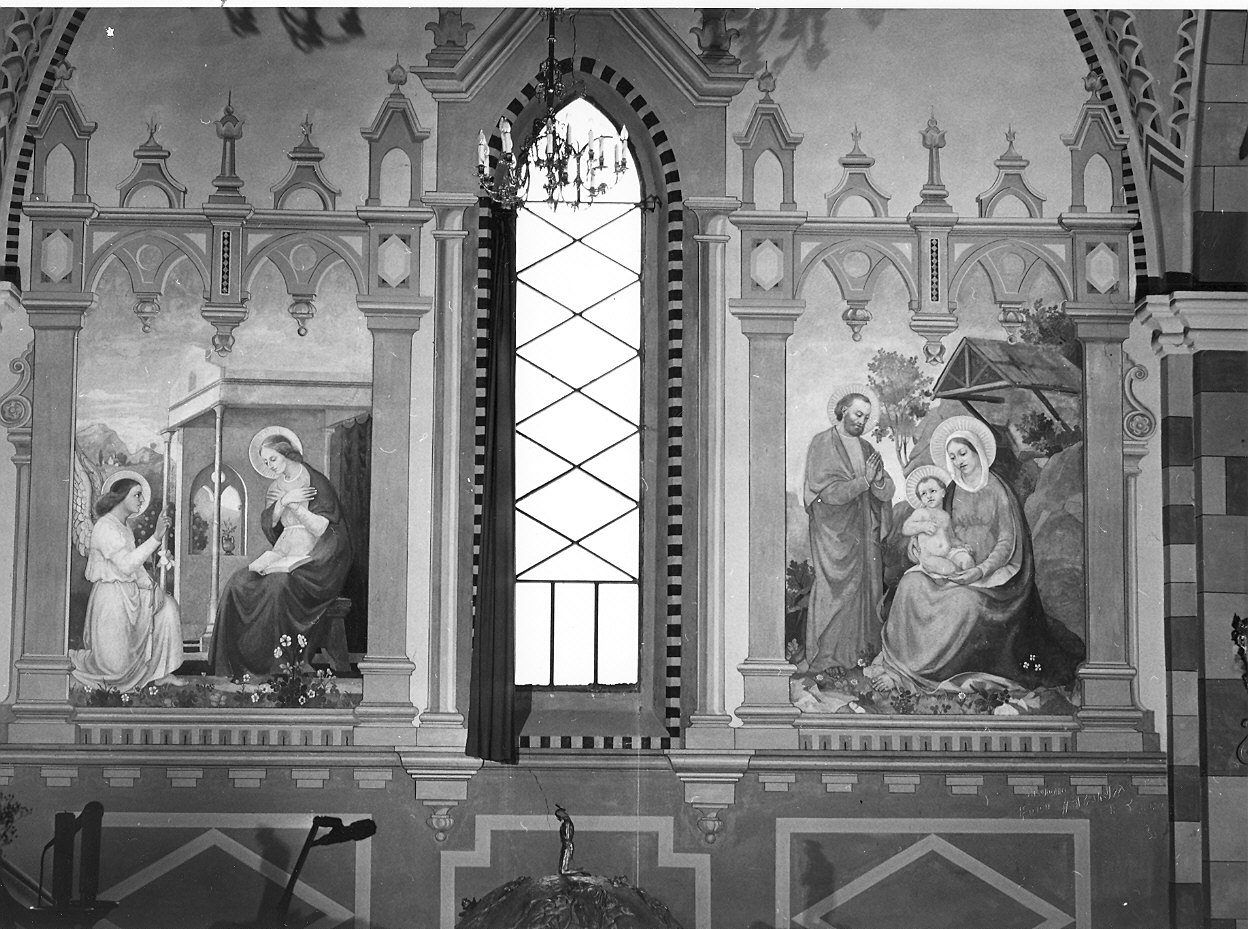 Personaggi: Madonna; Gesù Bambino; San Giuseppe. Paesaggi: sentiero nei pressi di una grotta. Elementi architettonici: cornice architettonica