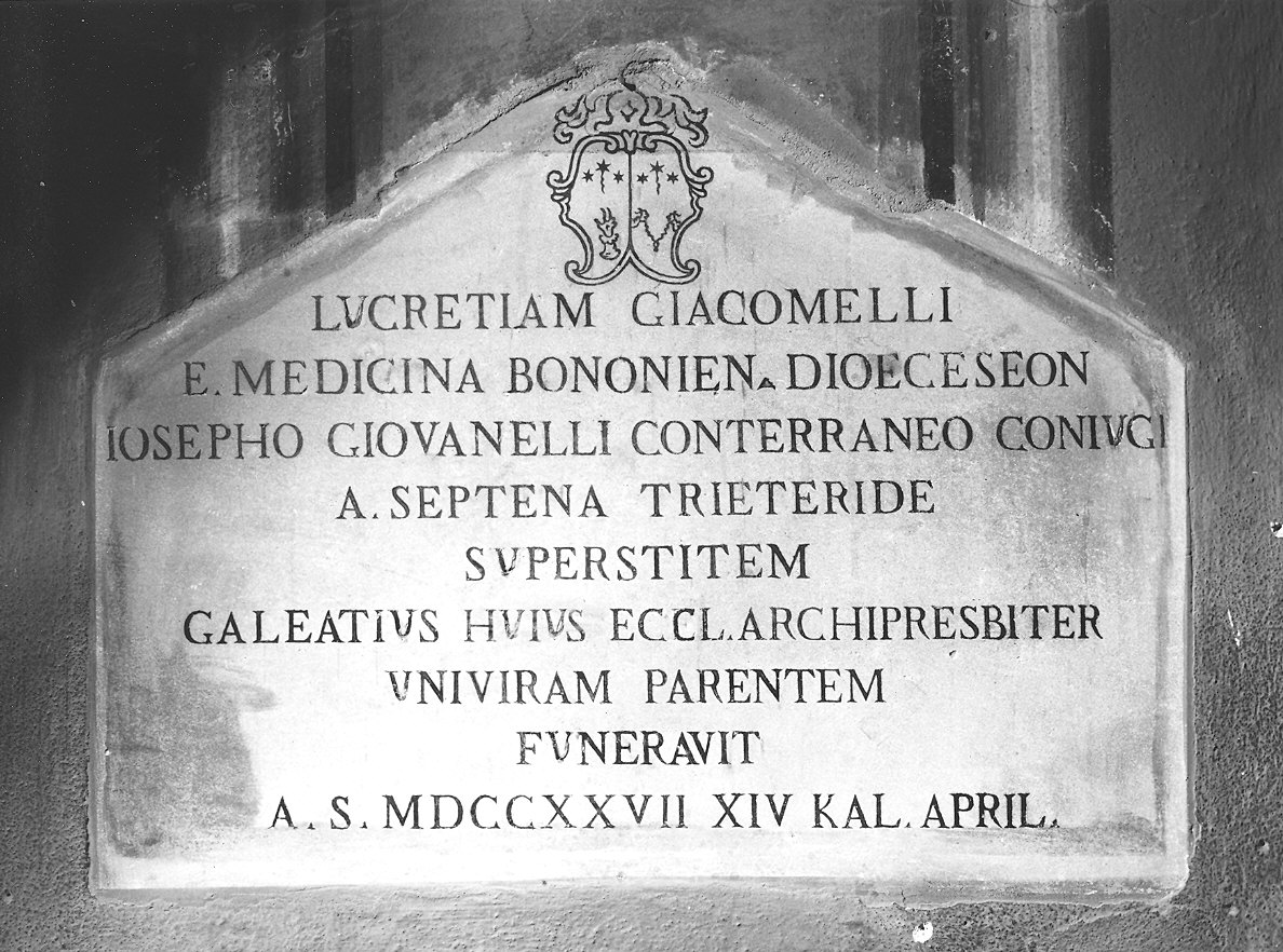 - NOTIZIE STORICO CRITICHE L'iscrizione ricorda le esequie di Lucrezia Giacomelli, celebrate nel 1727 dal figlio don Galeazzo Giovannelli; il sacerdote fu rettore di S. Lazzaro tra il 1732 e il 1754 e la lapide è certamente posteriore al 1732 poichè proprio in quell'anno don Giovannelli ricevette la nomina ad arciprete, titolo con il quale è menzionato nell'epigrafe