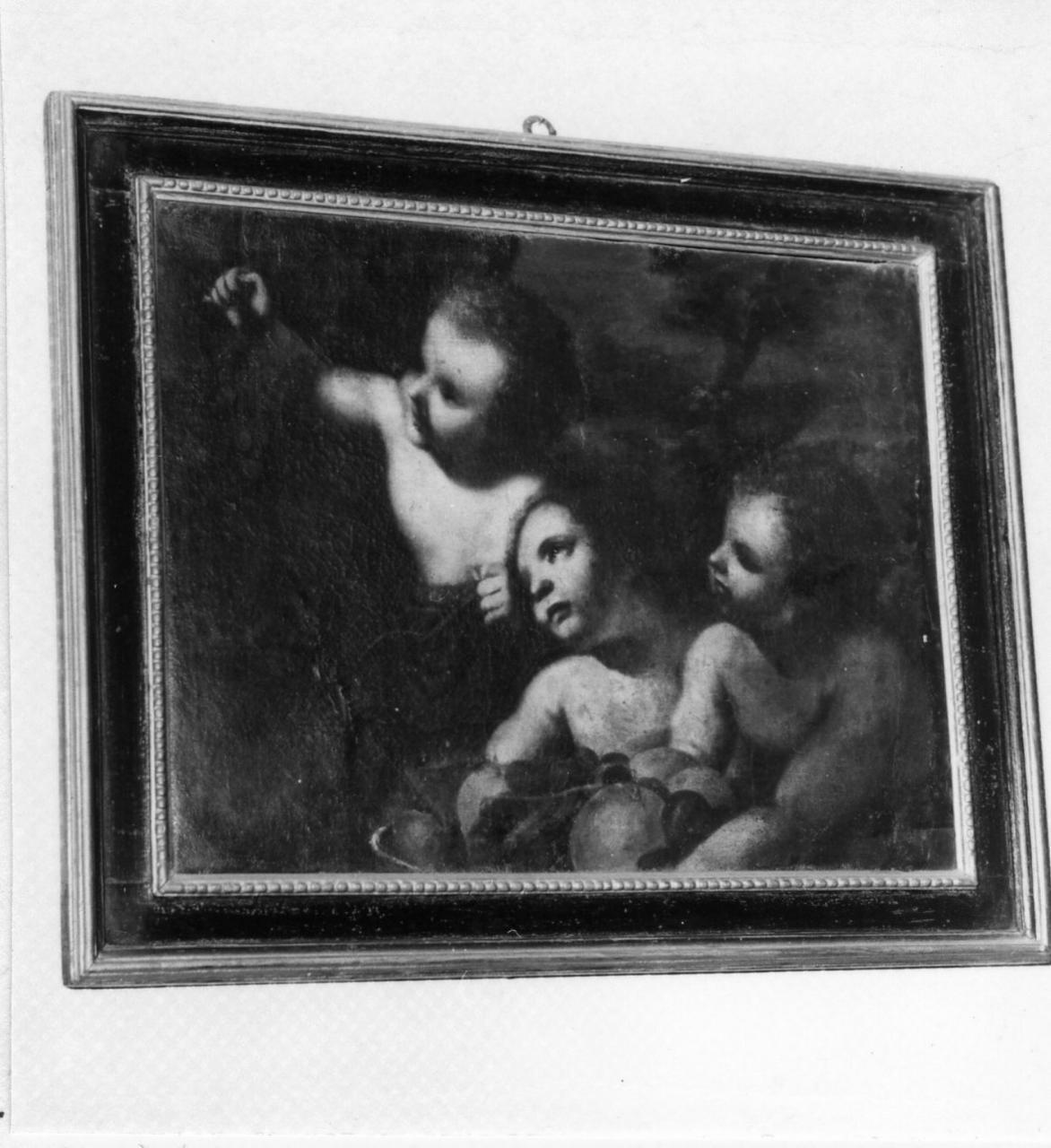 Tre putti ignudi di chiaro incarnato sfumato scherzano con un canestro di frutta. Nel fondo paesaggio boscoso molto scuro. Cornice di legno dipinto e dorato
