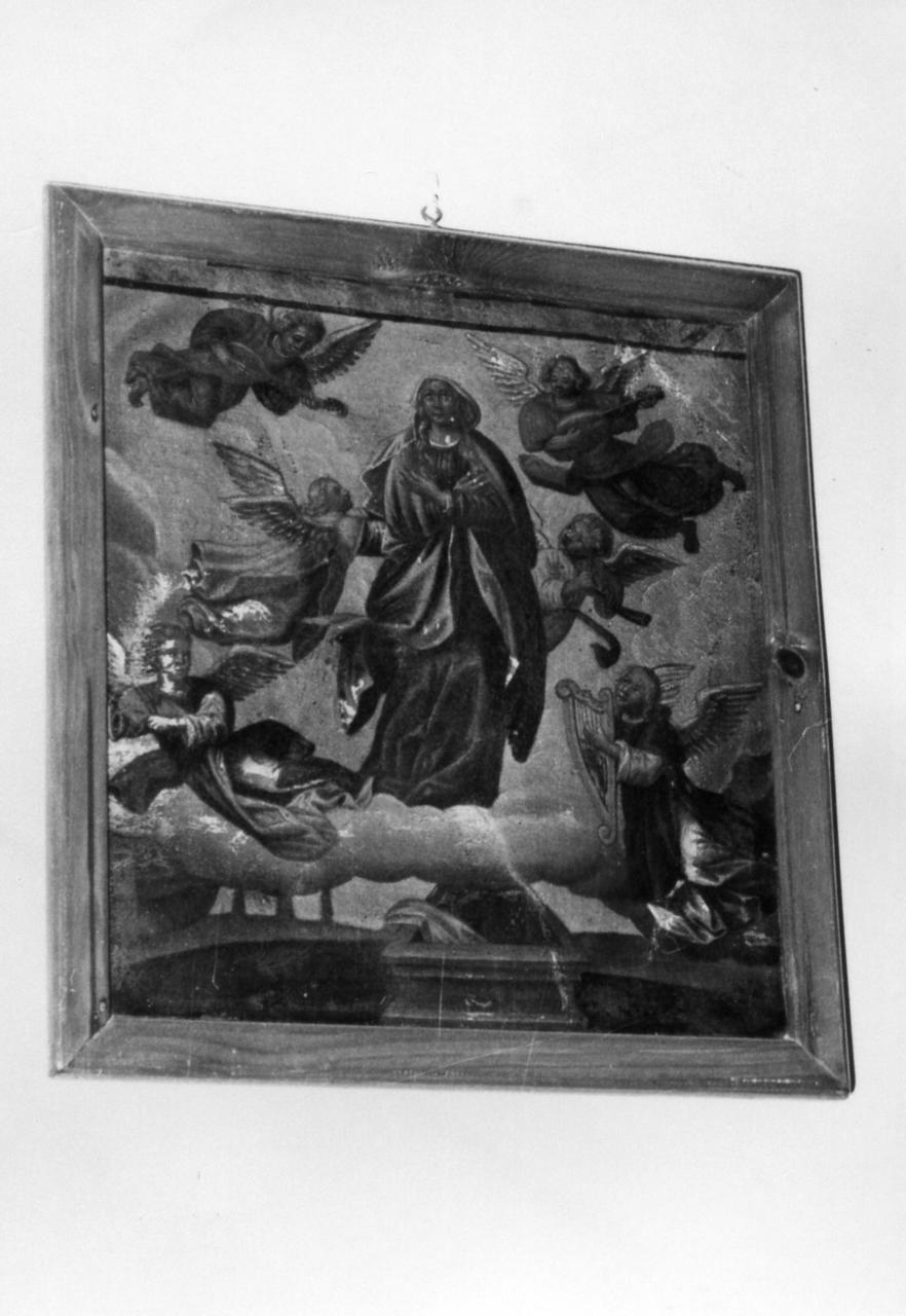 La Madonna, con vesti azzurre e rosse, sale al cielo sulle nubi accompagnata da angeli volanti, alcuni suonano strumenti musicali. In primo piano il sarcofago vuoto e fondo di paesaggio. In semplice cornice moderna di legno verniciato