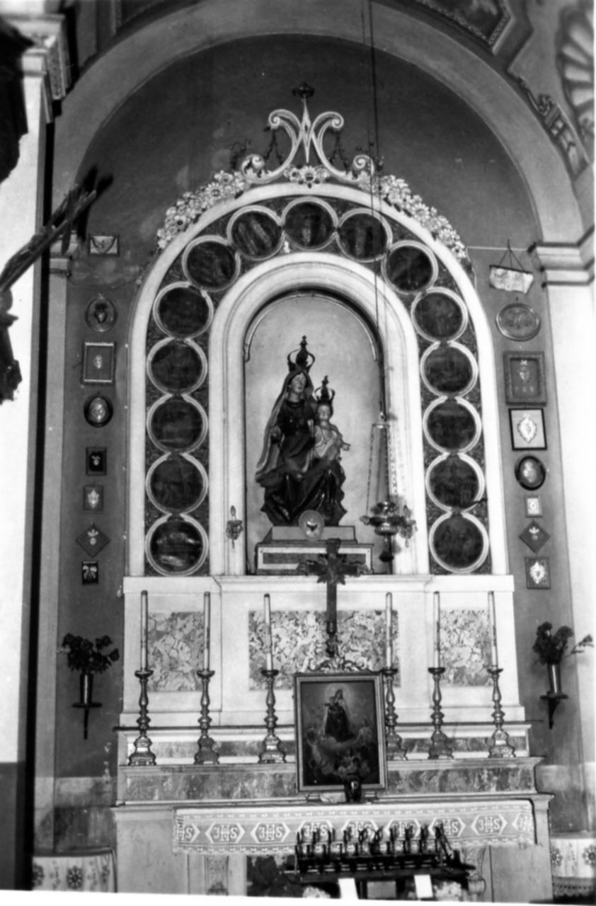 Plasticazione in scagliola in bassorilievo. Struttura architettonica bianca a specchiatura finto marmo rosato e violaceo nel basamento e con fregi fogliati dorati
