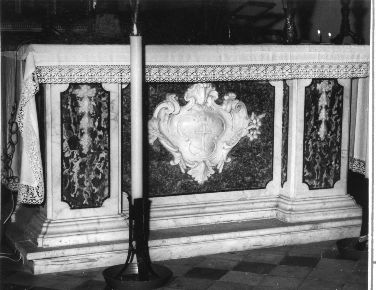 Struttura rettangolare massiccia, su piedistallo a gradino, costituita da marmo bianco di Carrara venato. Prospetto diviso in tre specchiature: le laterali sporgenti e la centrale rientrante. Gli specchi laterali sono incrostati di rosso venato, filettati di nero e adorni di festoni scolpiti a rilievo. Quello centrale è di breccia arancione e reca un medaglione con stemma, circondato da uno scudo a cartoccio adorno di gigli e palme del martirio, il tutto in marmo bianco statuario