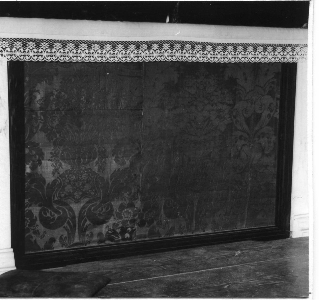 Paliotto mobile formato da una cornice di legno moderna, dove sono applicati frammenti di stoffa antica in broccato di seta a fondo giallo-oro con fiorami in rosso tipo damasco. Sulla stoffa sono raffigurati disegni di grossi vasi bacellati pieni di fiori, inseriti simmetricamente in volute a rombo che si intrecciano in fogliami