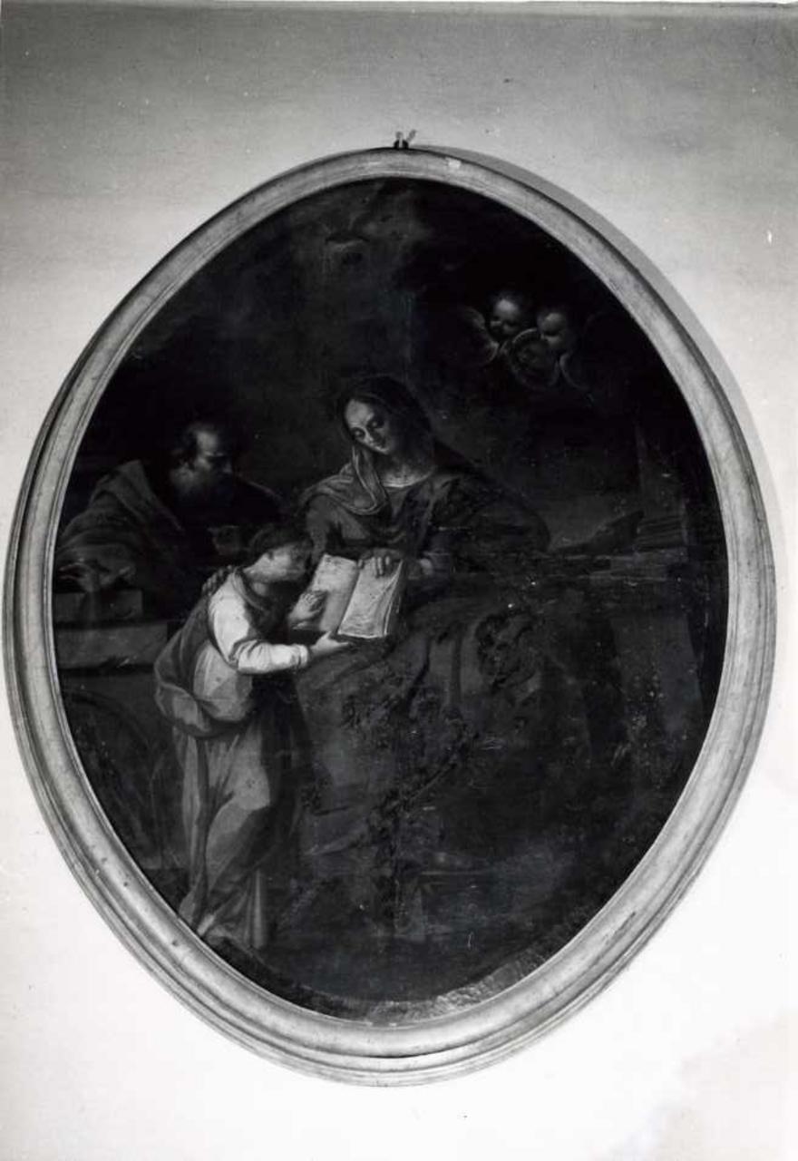 Il dipinto ha forma ovale. Sant'Anna, in veste azzurra, manto giallo scuro, è seduta ed insegna a leggere alla Madonna Bambina da un libro aperto che tiene sulle ginocchia. La Vergine ha tunica bianca e manto e manto azzurro. In secondo piano è San Gioacchino in veste verde e manto rosso. Nel fondo è presente un motivo architettonico con un accenno di paesaggio. Il alto, tra le nubi, spiccano la colonna dello Spirito Santo e due Cherubini. Il dipinto è inserito in cornice coeva di legno dipinto di giallo