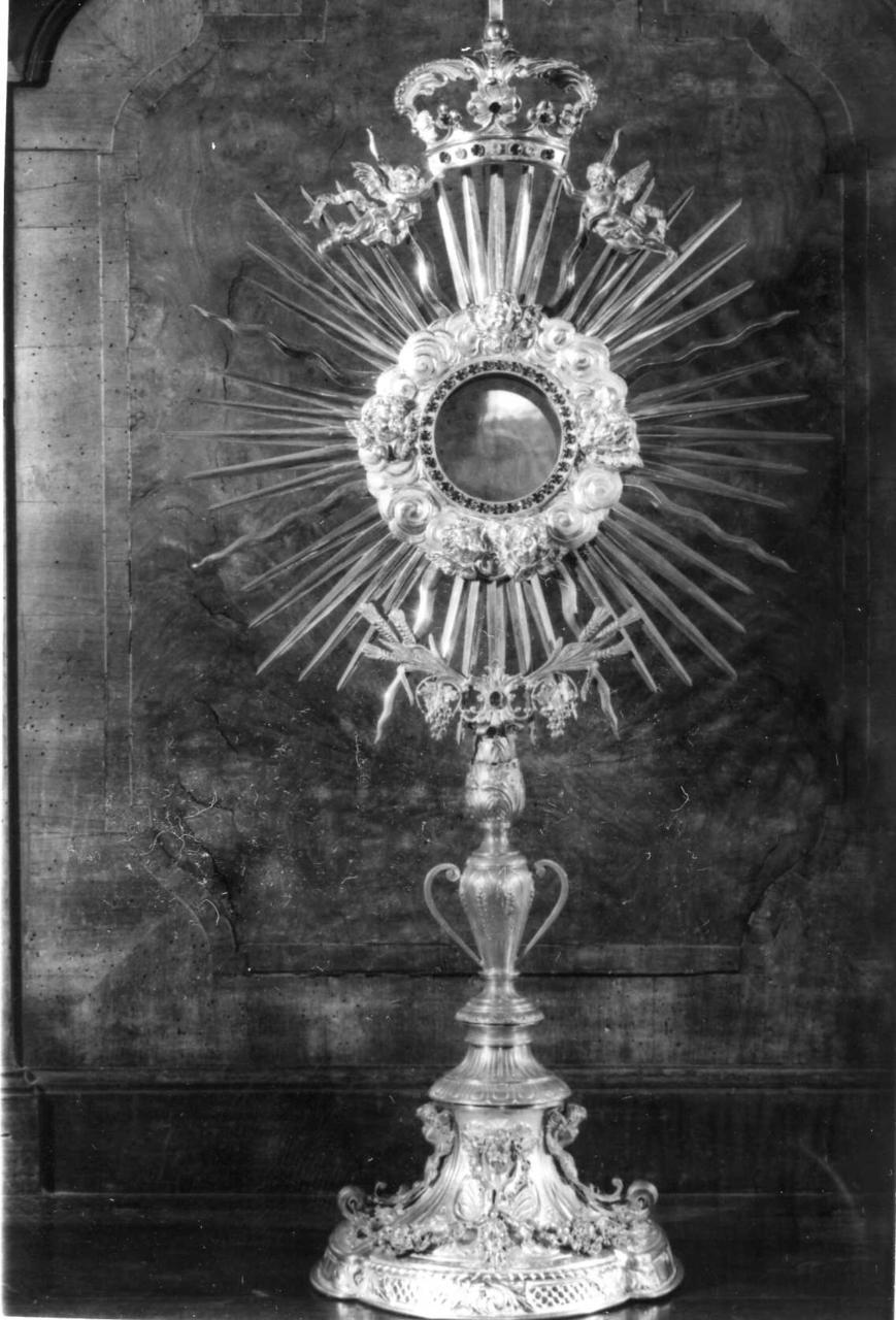 Piede tondeggiante, mistilineo con orolo eretto e traforato a retinatura interrotto da cherubini e fogliami che si evolvono in volute nel dorso conico, sostenute da cherubini a tutto tondo, allaciate a festone e valve di conchiglia. Il fusto è allungato a forma di anfora con manici arcuati, percorso da listature e concluso da cespo di foglie. Teca rotonda, sospesa entroampia raggiera seghettata ed appuntita. In basso trofeo di spighe e grappoli, nel sommo due angioletti reggono una grande corona adorna di pietre colorate sormontata da una crocetta. Punzne di assaggio 800